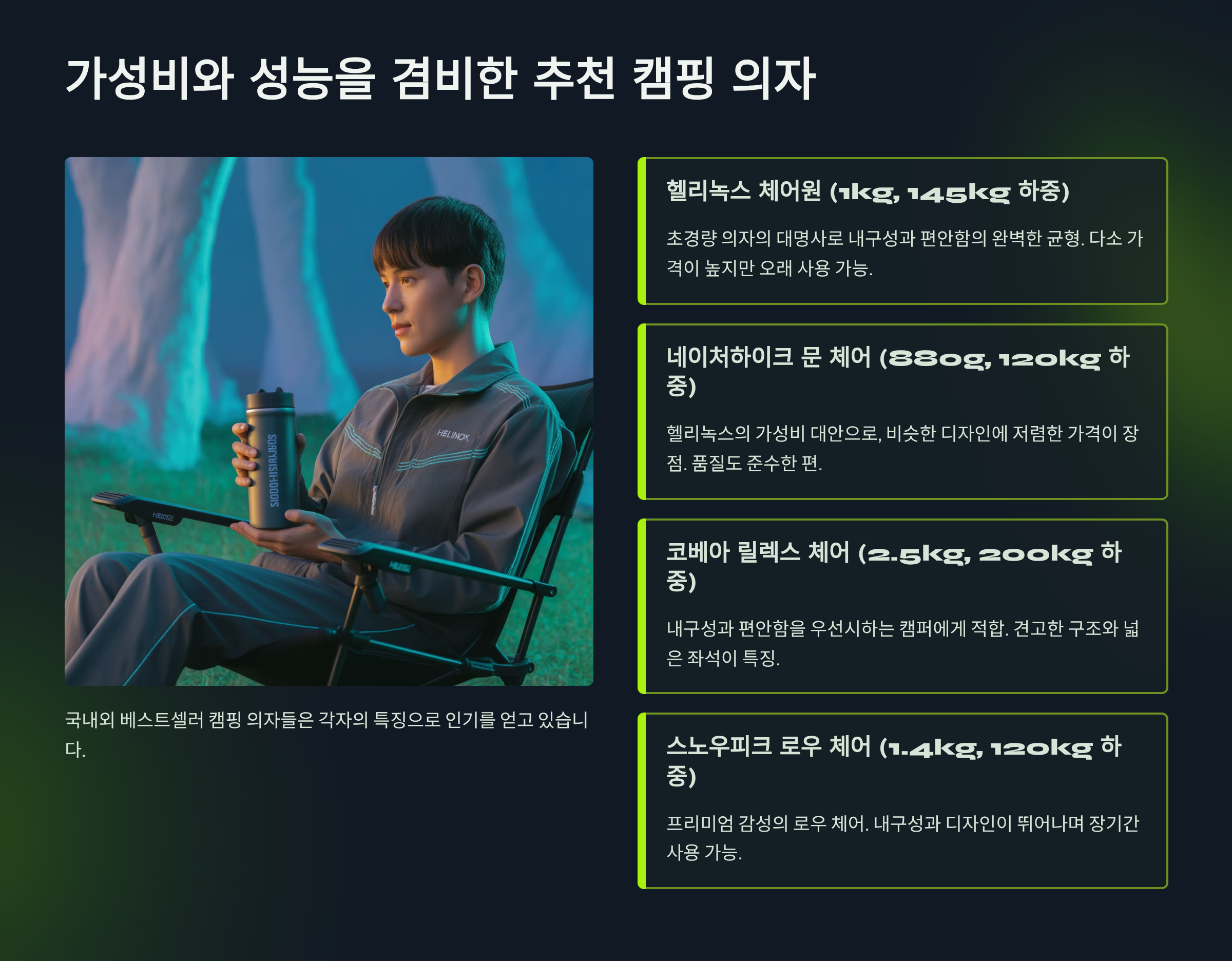 | 헬리녹스 (체어원, 체어투 등) | 초경량, 높은 내하중, 혁신적인 디자인 | 압도적인 휴대성, 뛰어난 내구성, A/S 용이 | 백패커, 미니멀 캠퍼, 경량 중시 사용자 |