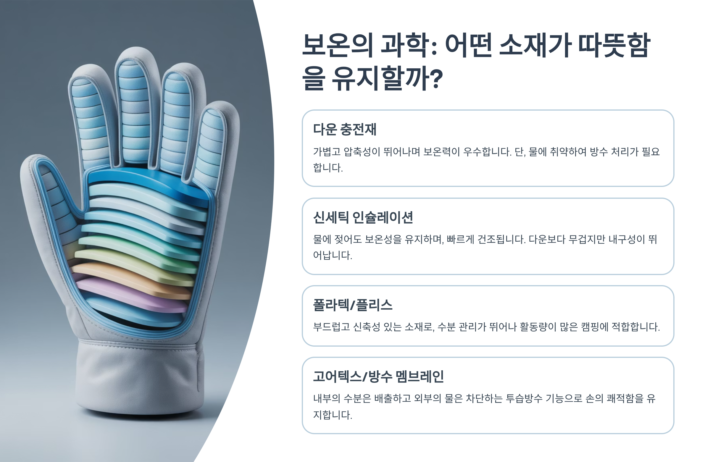 | 다운 (오리/거위털) | 가벼움, 우수한 보온력, 압축성 | 습기에 약함, 관리 필요 | 고성능 방한 장갑, 익스트림용 |