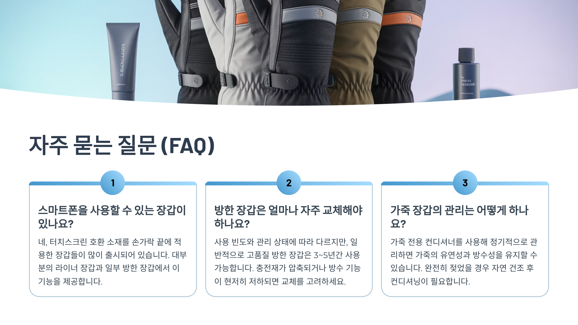 | 방수/방풍 기능 | 눈, 비, 강풍 노출 여부 | 고어텍스, 방수 코팅, 방풍 소재 적용 장갑 |