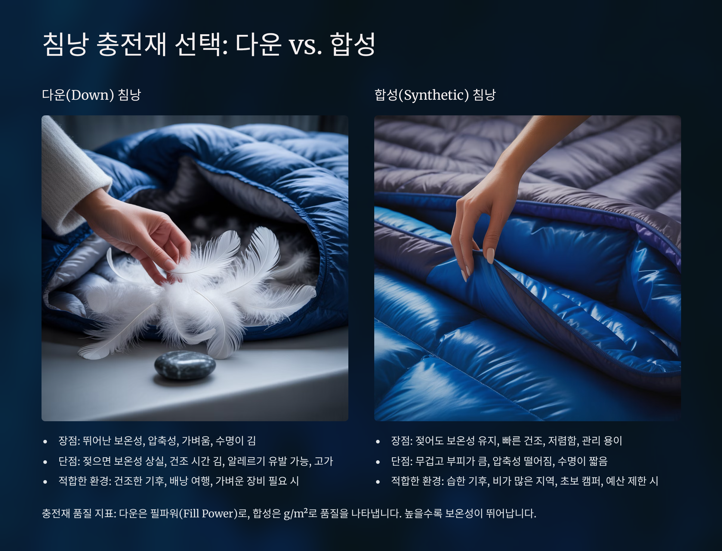 침낭의 보온력과 무게, 부피를 결정하는 가장 큰 요인은 바로 충전재입니다. 주로 오리털이나 거위털을 사용하는 다운(Down) 침낭과 인공 섬유를 사용하는 합성 충전재(Synthetic) 침낭으로 나뉩니다. 각 충전재는 장단점이 명확하므로 자신의 캠핑 스타일과 예산에 맞춰 신중하게 선택해야 합니다.