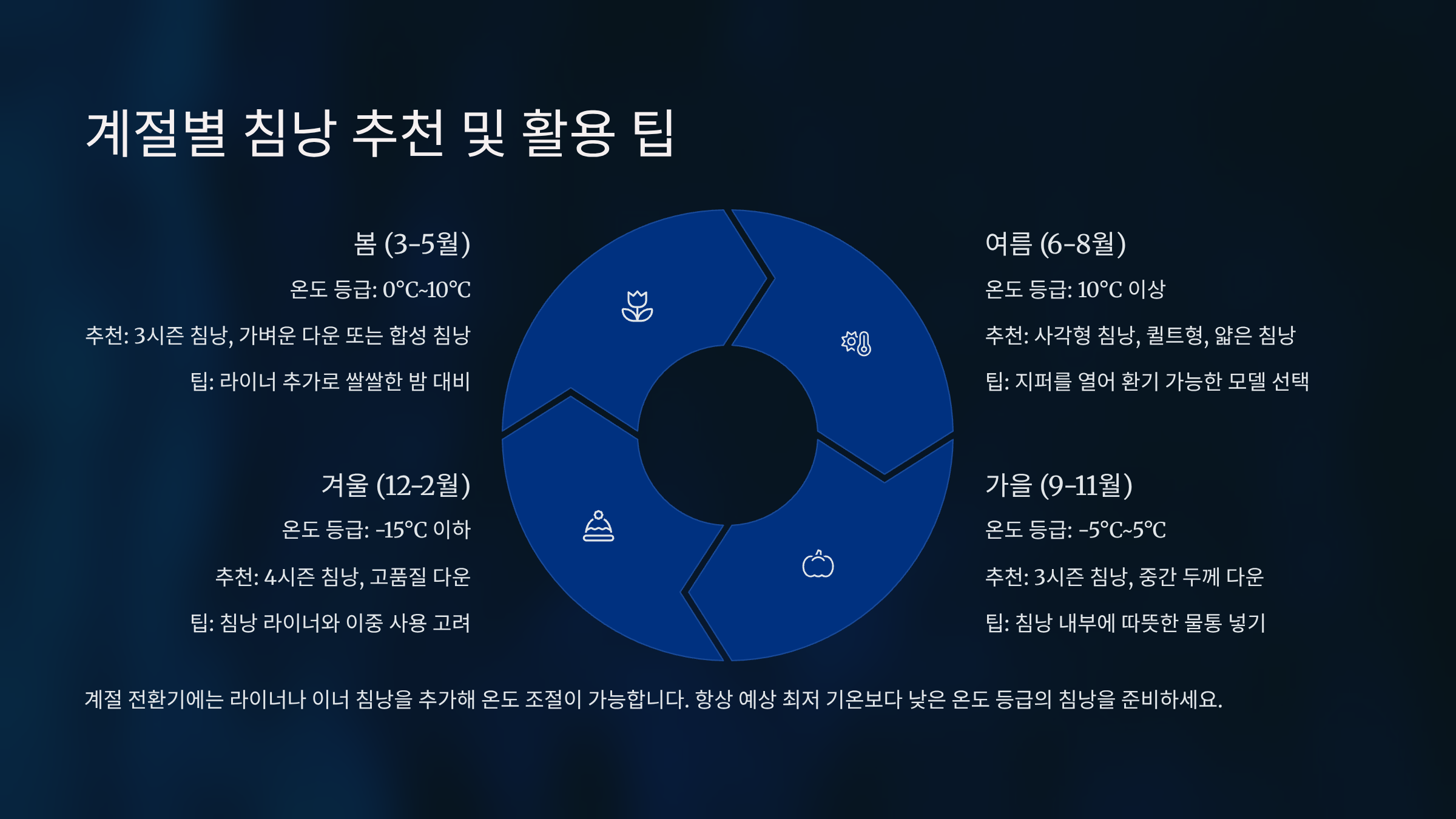 | 계절 | 추천 침낭 온도 등급 (컴포트 기준) | 추천 충전재 및 형태 | 활용 팁 |