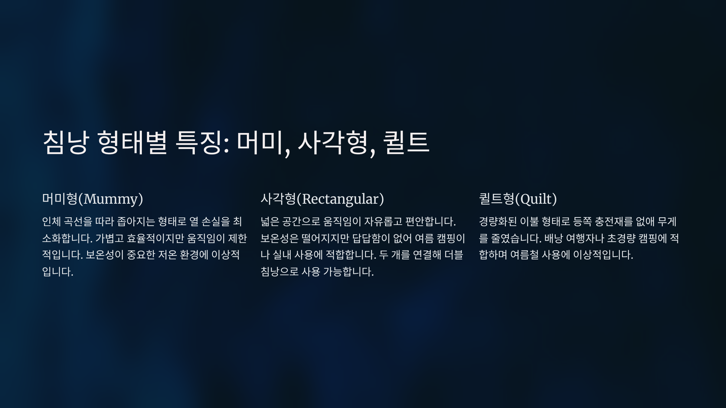 | 머미형 (Mummy) | 인체 곡선에 맞춰 제작, 발끝까지 좁아짐 | 뛰어난 보온 효율, 가벼움, 작은 수납 부피 | 활동 공간 제약, 답답함을 느낄 수 있음 |
