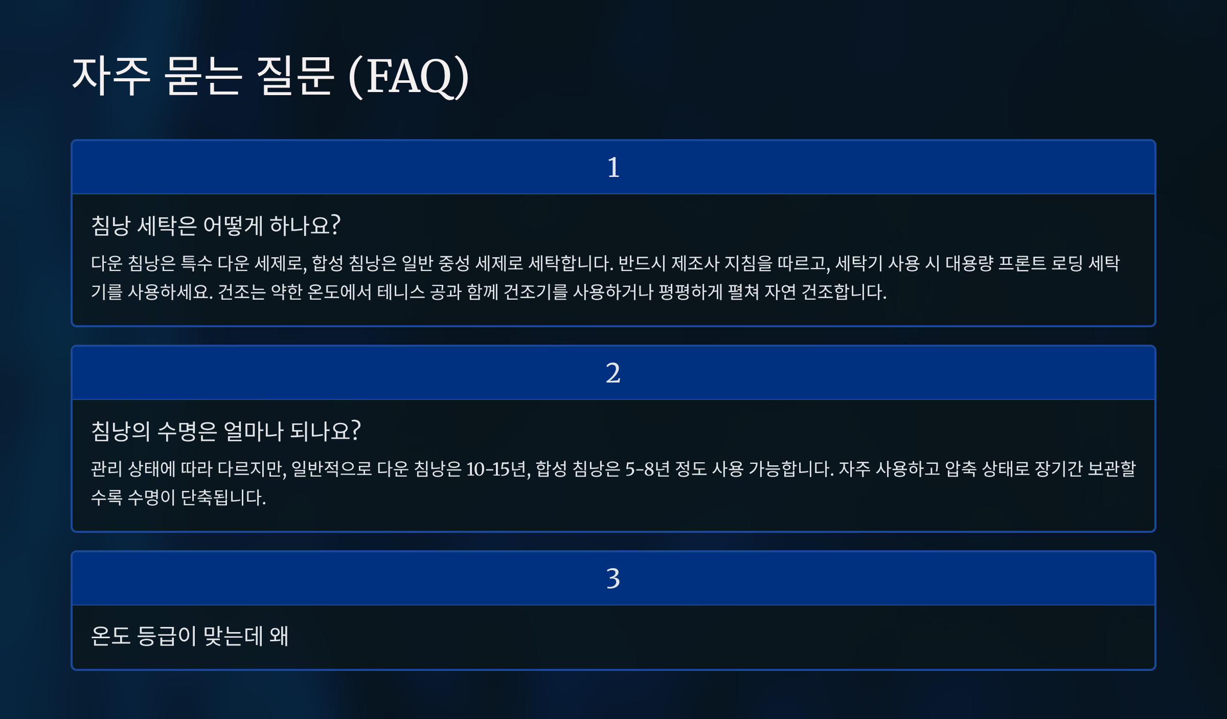 | 세탁 방법 | 오염 시 전문 세탁소 의뢰 또는 중성세제로 손세탁 후 완전히 건조 | 자주 세탁하지 않기 (보온력 저하), 건조 시 두드려서 충전재 골고루 펴주기 |