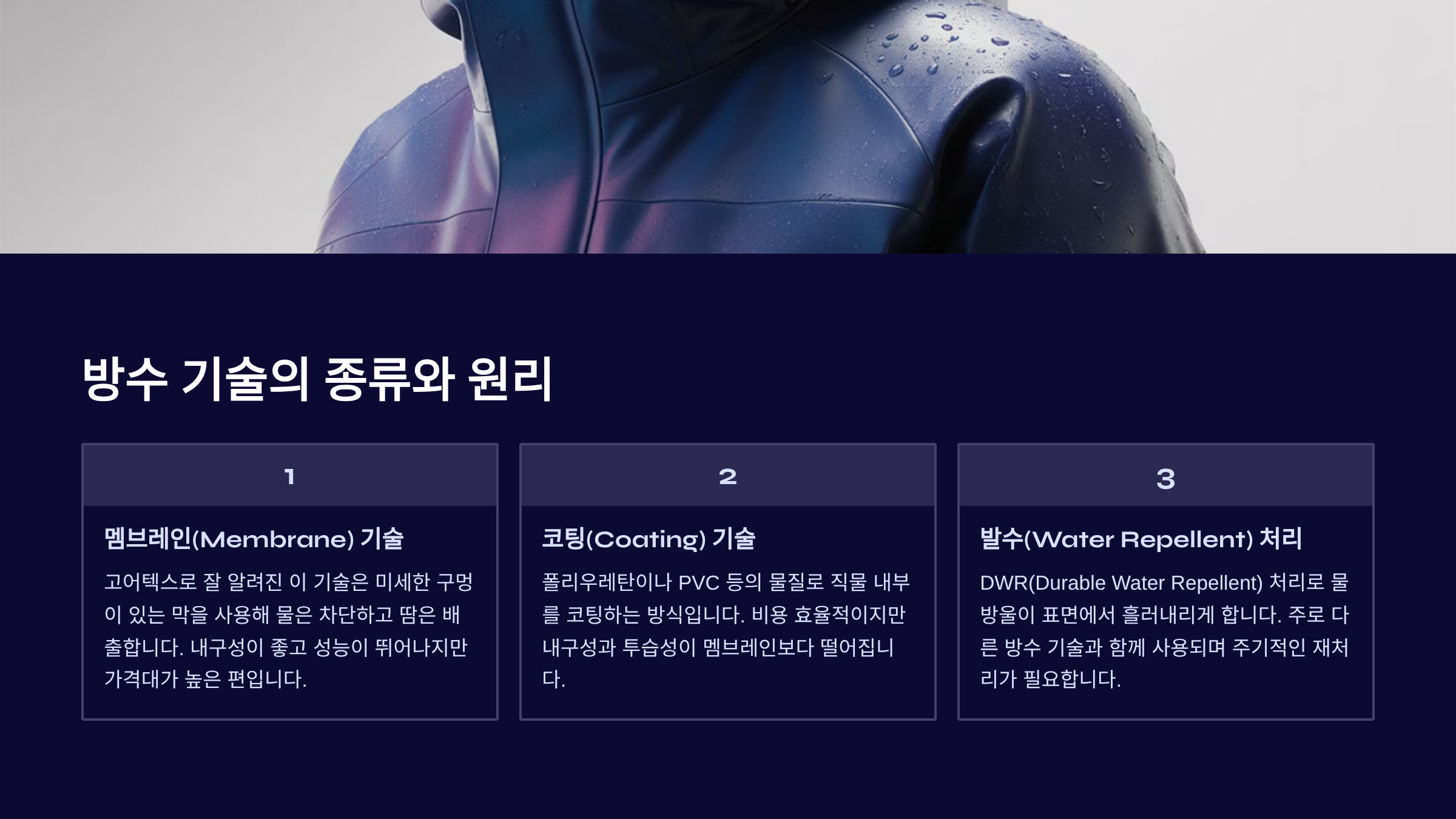 | 코팅 방수 (DWR) | 원단 표면에 발수 코팅 처리 | 저렴한 가격, 가벼움 | 내구성 약함, 투습성 한계 |