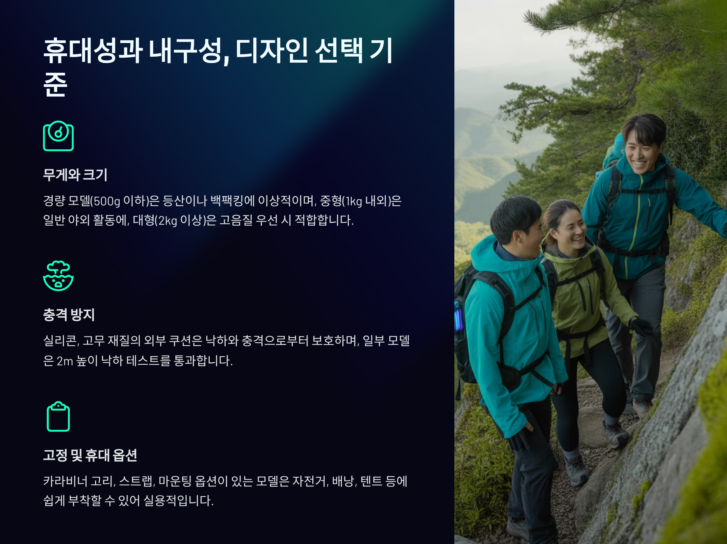 | 휴대성 | 무게, 크기, 스트랩/고리 유무 | 자전거 라이딩, 등산, 휴대성 중시 사용자 |