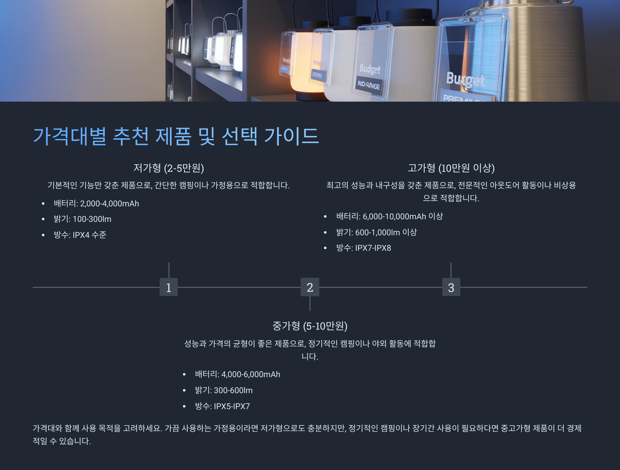 | 5만원 전후 | 적절한 밝기, 보조 배터리 등 부가 기능 | 일반적인 캠핑, 야외 활동 |