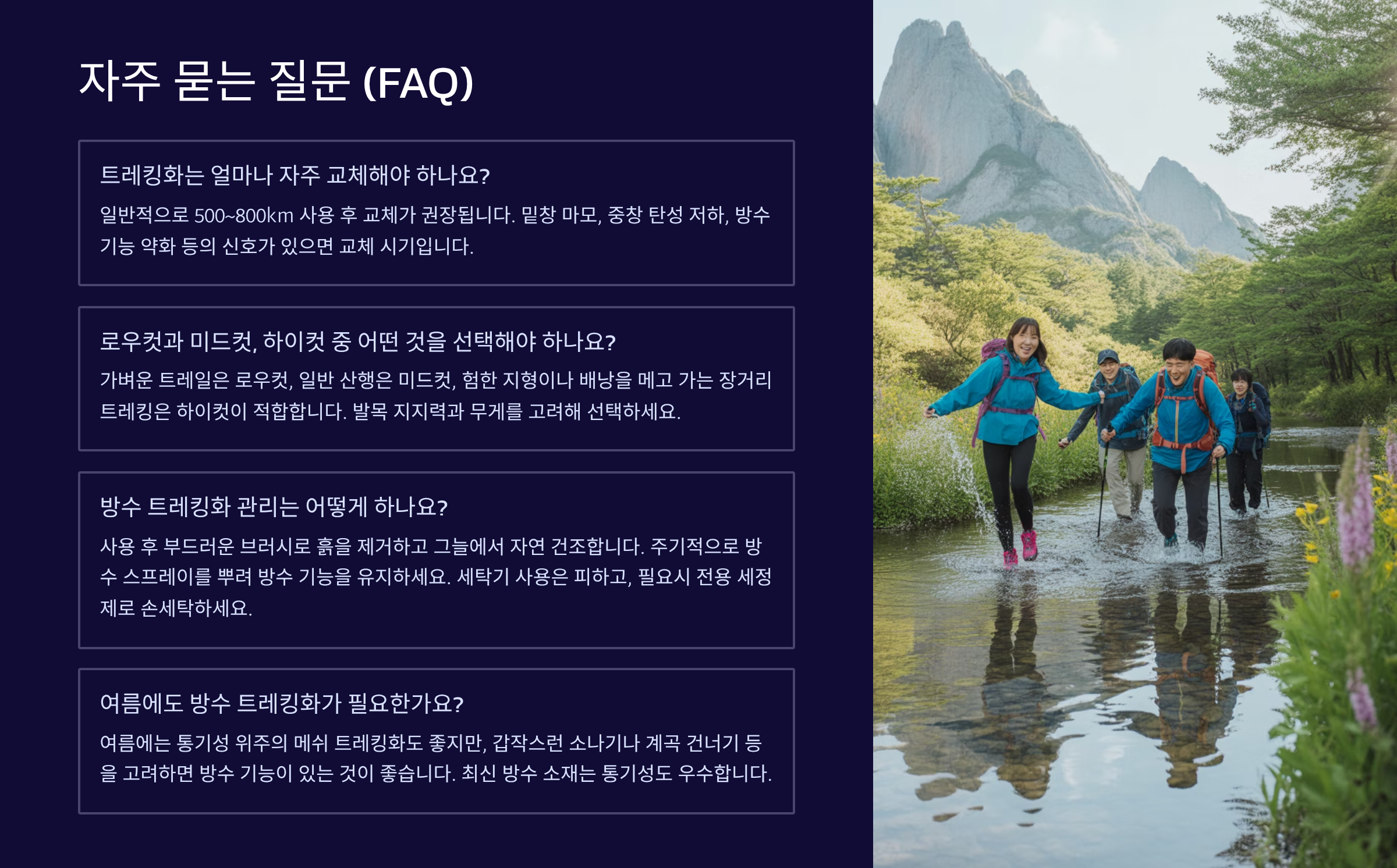 이 글은 편안한 방수 트레킹화 선택에 대한 일반적인 정보를 제공하며, 특정 개인의 발 모양, 건강 상태, 트레킹 환경 등에 대한 전문적인 조언이 아닙니다. 개인의 상황에 맞는 신발 선택을 위해서는 전문가와 상담하거나 직접 여러 제품을 신어보는 것을 권장합니다. 이 정보를 바탕으로 한 결정에 대해 작성자는 어떠한 책임도 지지 않습니다.