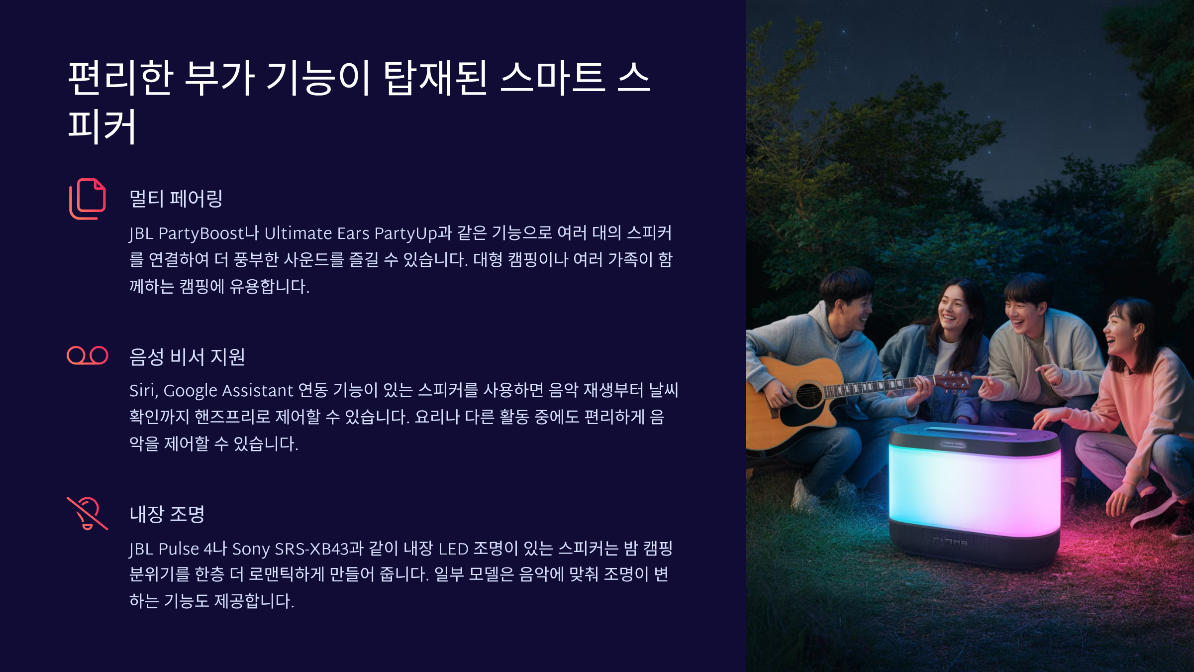 | D 스피커 | 360도 전 방향 사운드, 강력한 베이스 | 음악 감상을 중요하게 여기는 캠퍼 |