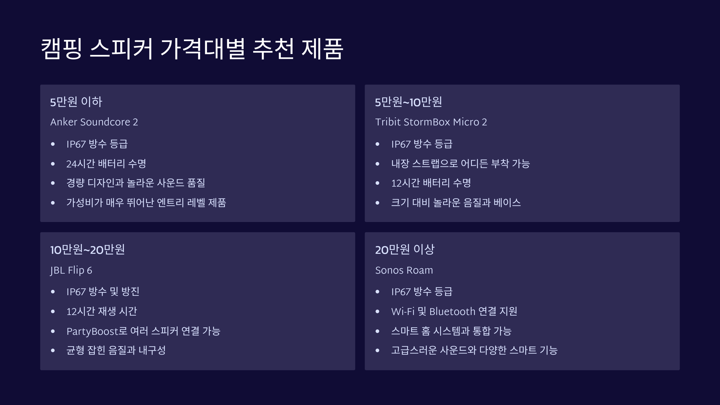 | 5만원 미만 | 가성비, 기본적인 방수/방진 기능 | 캠핑 스피커 입문자, 서브 스피커 용도 |