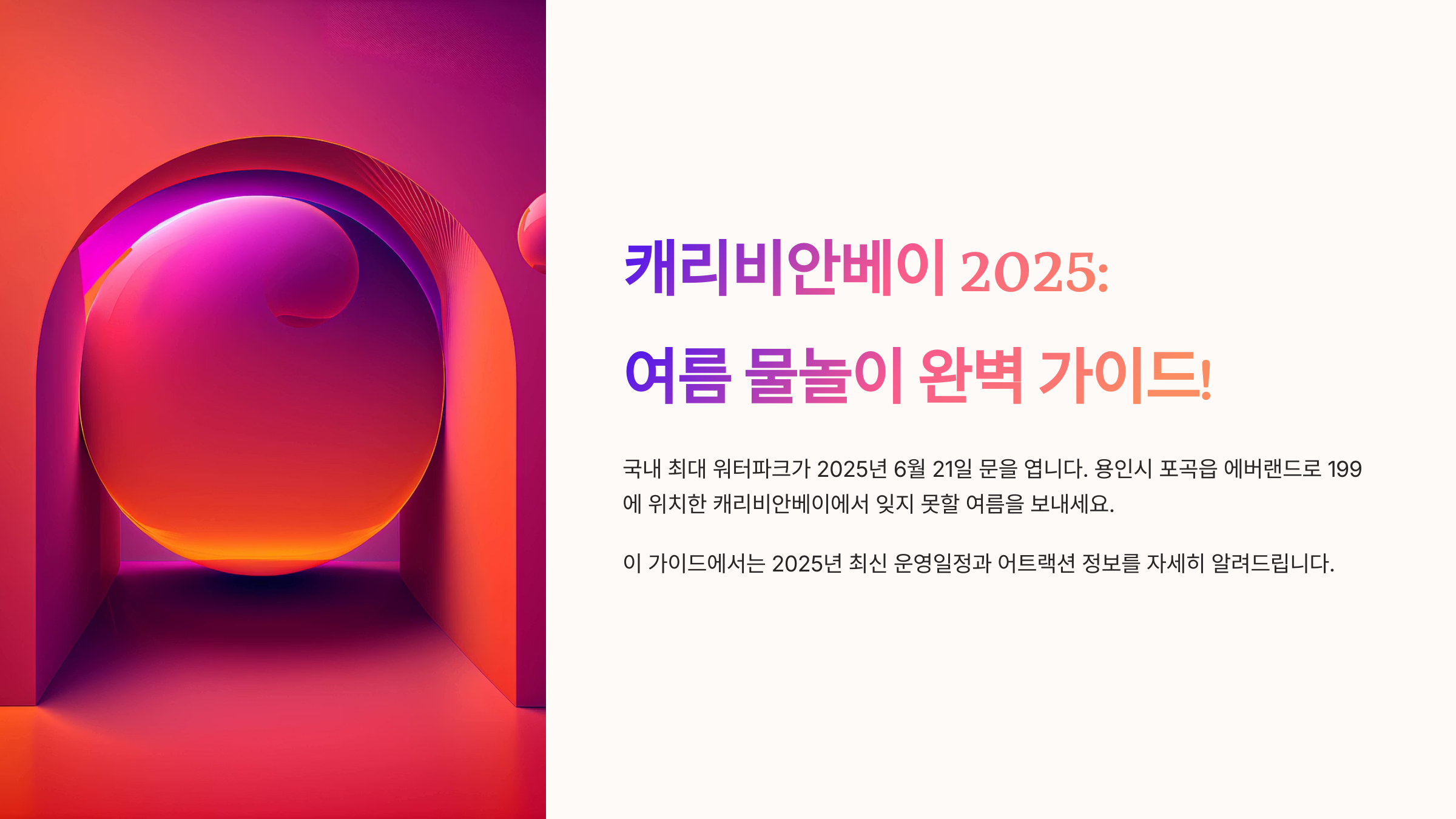 본 가이드는 캐리비안베이를 처음 방문하는 분들부터 매년 찾는 재방문객까지, 모두에게 유용한 정보를 제공합니다. 어트랙션, 준비물, 음식, 할인 팁, 가는 길 등 핵심적인 내용만 쏙쏙 뽑아 담았습니다. 이국적인 분위기 속에서 펼쳐지는 다양한 즐거움을 미리 계획해보세요. 여러분의 완벽한 여름 휴가를 위해 모든 정보를 준비했습니다.