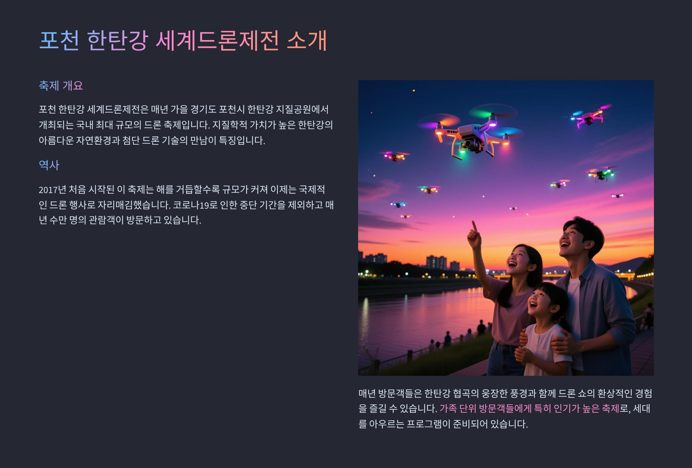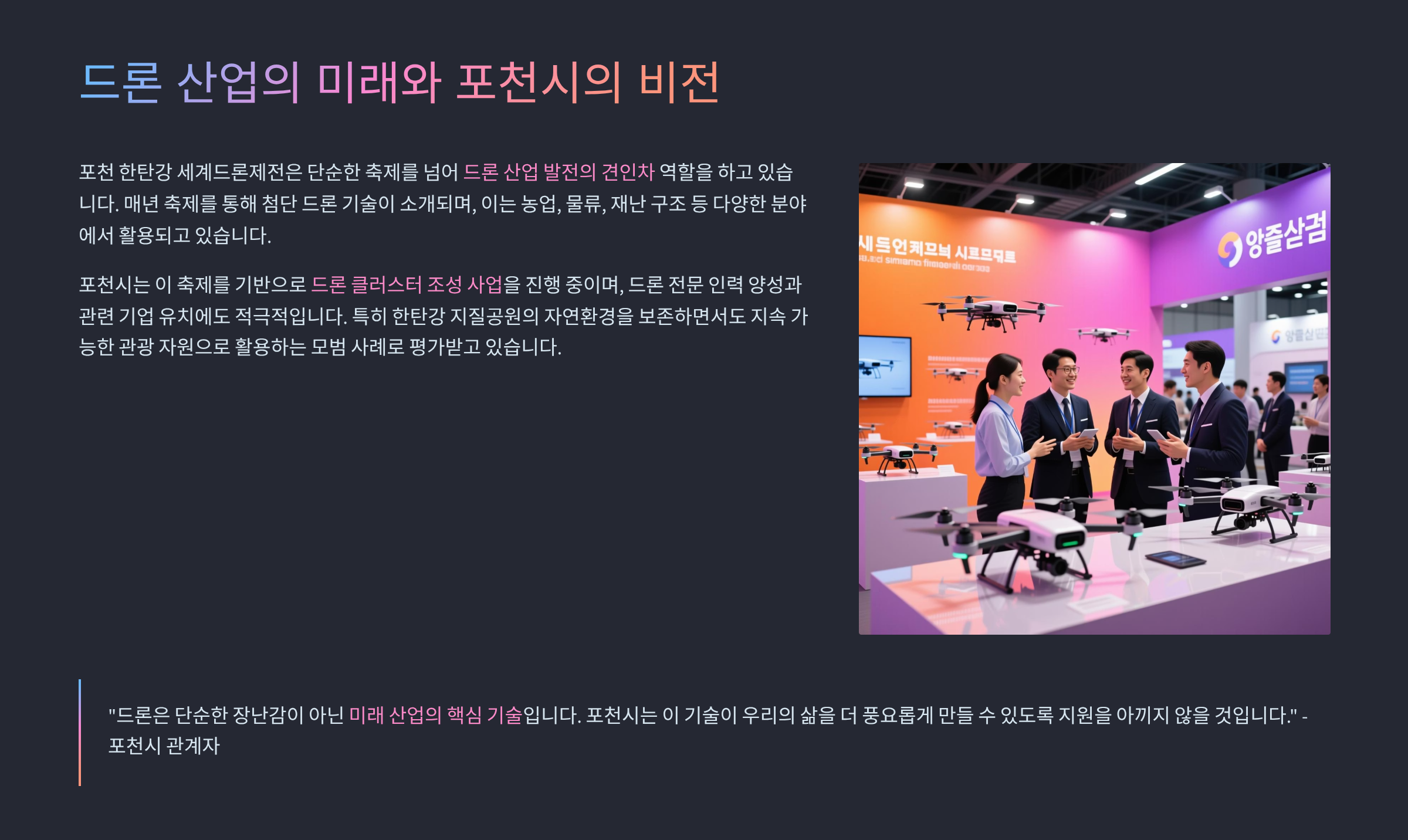 이 글은 포천 한탄강 세계드론제전에 대한 일반적인 정보를 제공하는 목적으로 작성되었습니다. 축제 일정, 프로그램, 정책 등은 주최 측의 사정에 따라 변동될 수 있으며, 방문 전 반드시 공식 홈페이지를 통해 최신 정보를 확인하시기 바랍니다. 이 정보로 인해 발생하는 직간접적 손해에 대해 책임지지 않습니다. 모든 결정은 개인의 판단 하에 이루어져야 합니다.