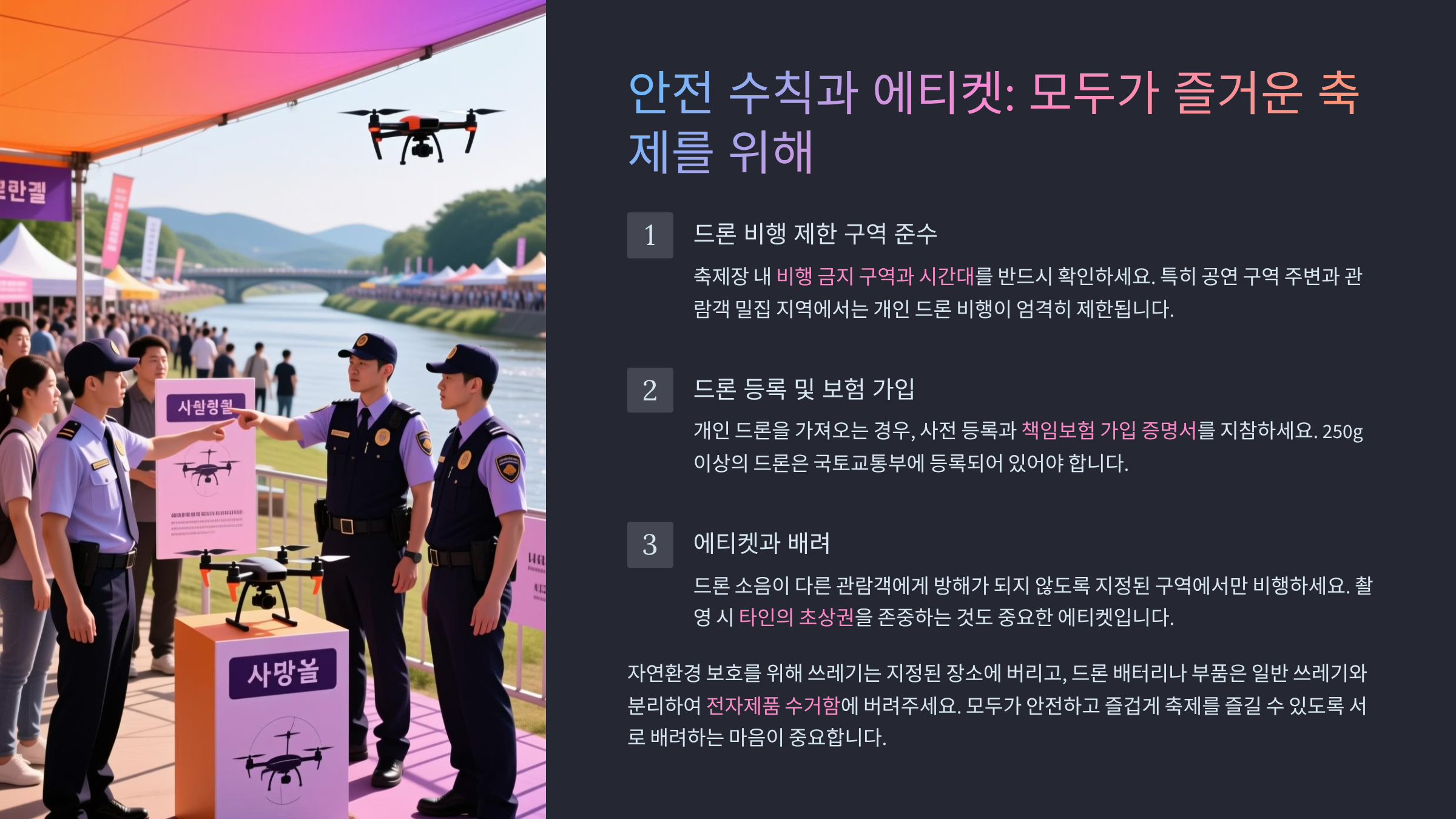 안전 수칙 전문 보기축제는 많은 사람들이 모이는 곳인 만큼, 서로를 배려하는 에티켓이 중요합니다. 혼잡한 시간에는 주변 사람들과 부딪히지 않도록 조심하고, 특히 아이들이나 노약자가 있다면 양보하는 마음을 가져야 합니다. 개인적인 안전뿐만 아니라 모두의 안전을 위해 운영진의 안내에 적극적으로 협조하는 태도가 필요합니다. 만약 비상 상황이 발생하면 가까운 운영 본부나 안전 요원에게 즉시 도움을 요청하세요. 포천 한탄강 세계드론제전은 안전을 최우선으로 하여 성공적인 축제를 만들고자 노력하고 있습니다. 이 글에서 언급된 수칙들을 숙지하고 방문하신다면, 더욱 안전하고 즐거운 축제를 경험할 수 있을 것입니다.