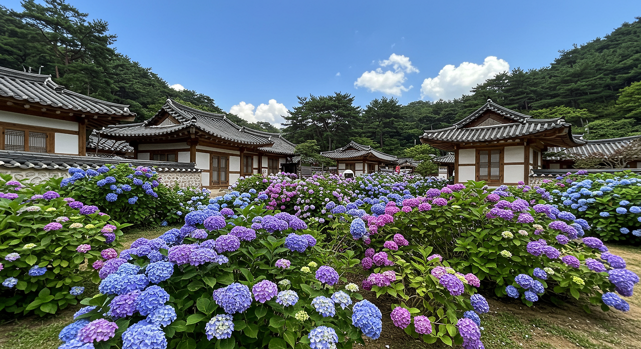 제주민속촌은 제주의 전통 생활 방식을 보존하고 있는 문화 공간으로, 수국축제 기간에는 더욱 특별한 모습을 선보여요. 전통 한옥과 정원이 조화롭게 어우러진 이곳에는 축제를 위해 특별히 조성된 수국 정원이 방문객들을 맞이합니다.