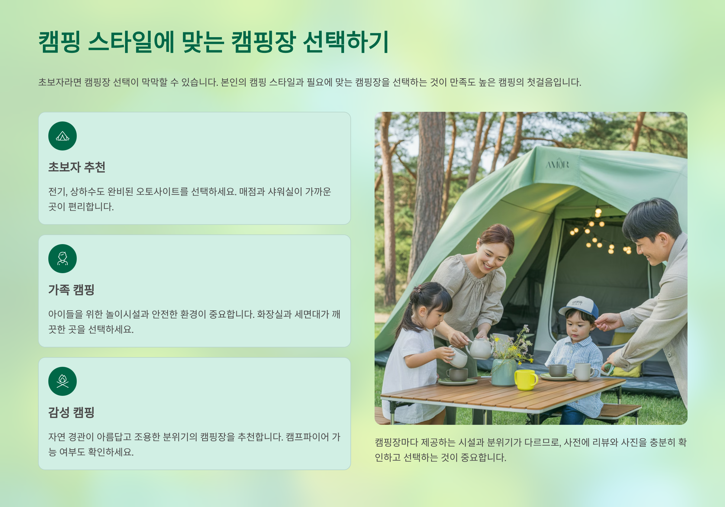 사용자 경험 강조: 캠핑 스타일과 목적에 맞는 캠핑장을 선택하고, 후기를 통해 실제 이용 환경을 꼼꼼히 확인하면 만족스러운 캠핑을 즐길 수 있습니다.