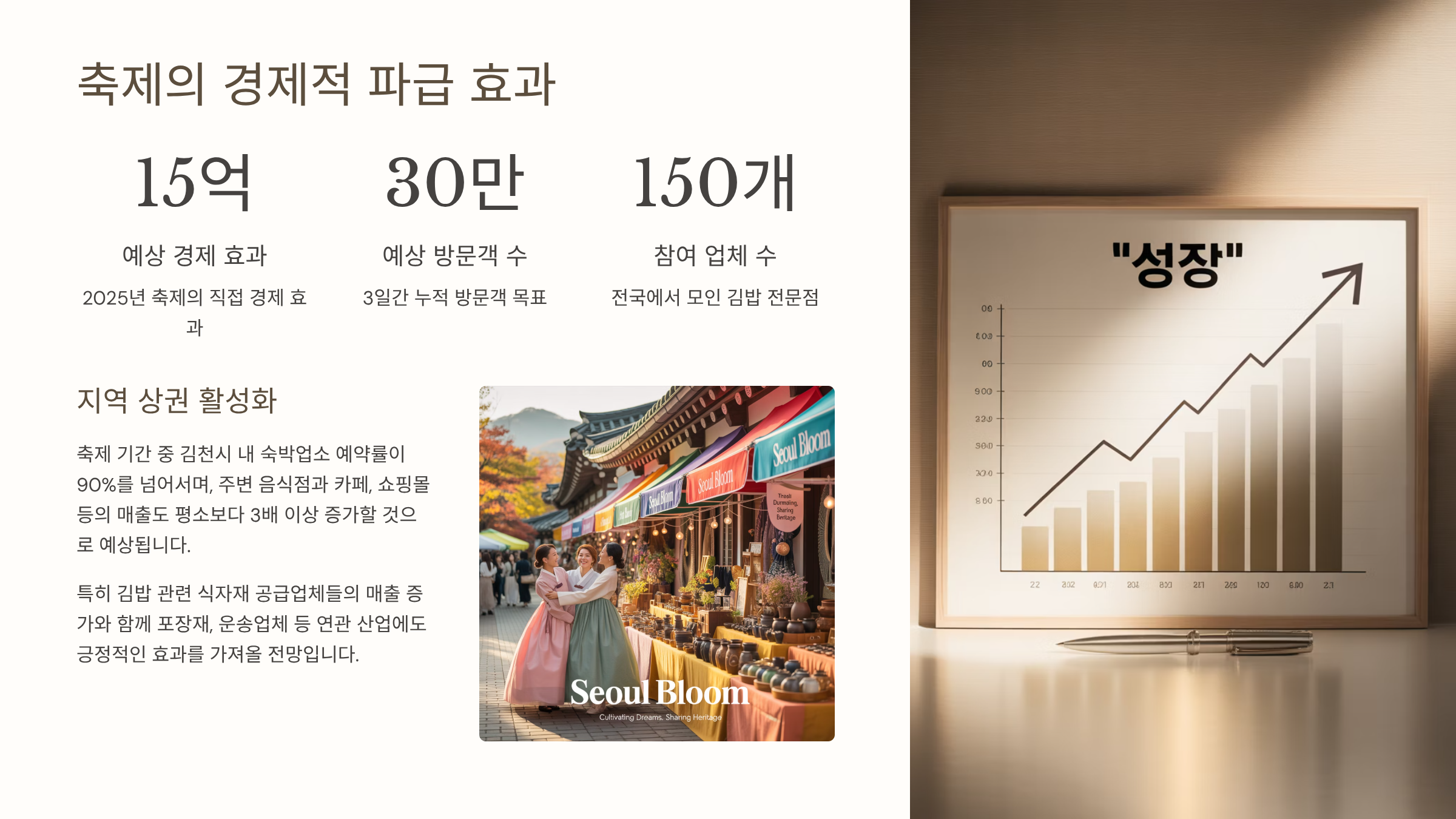 김천김밥축제는 단순한 먹거리 축제를 넘어 김천 지역 경제 활성화에 크게 기여했습니다. 축제 기간 동안 직지 상가 등 인근 상권의 매출이 급증했으며, 이는 지역 주민들에게 직접적인 경제적 이익으로 돌아왔습니다. 또한, '김밥의 도시 김천'이라는 새로운 이미지를 전국에 각인시키는 데 성공하며, 도시 브랜드 가치를 크게 높였습니다. 올해 축제는 이러한 긍정적인 파급 효과를 더욱 확대하기 위해 외국인 관광객 유치에도 적극 나설 예정입니다. K-콘텐츠와 연계한 홍보, 영어 안내 인력 배치 등 글로벌 축제로의 성장을 위한 기반을 다지고 있습니다. 전문가들은 김천김밥축제가 앞으로도 지속적인 콘텐츠 개발과 운영 시스템 개선을 통해, 부산의 불꽃축제, 보령의 머드축제처럼 대한민국을 대표하는 글로벌 축제로 성장할 잠재력이 충분하다고 평가하고 있습니다. 김천김밥축제가 보여줄 새로운 가능성에 많은 기대가 모아지고 있습니다.