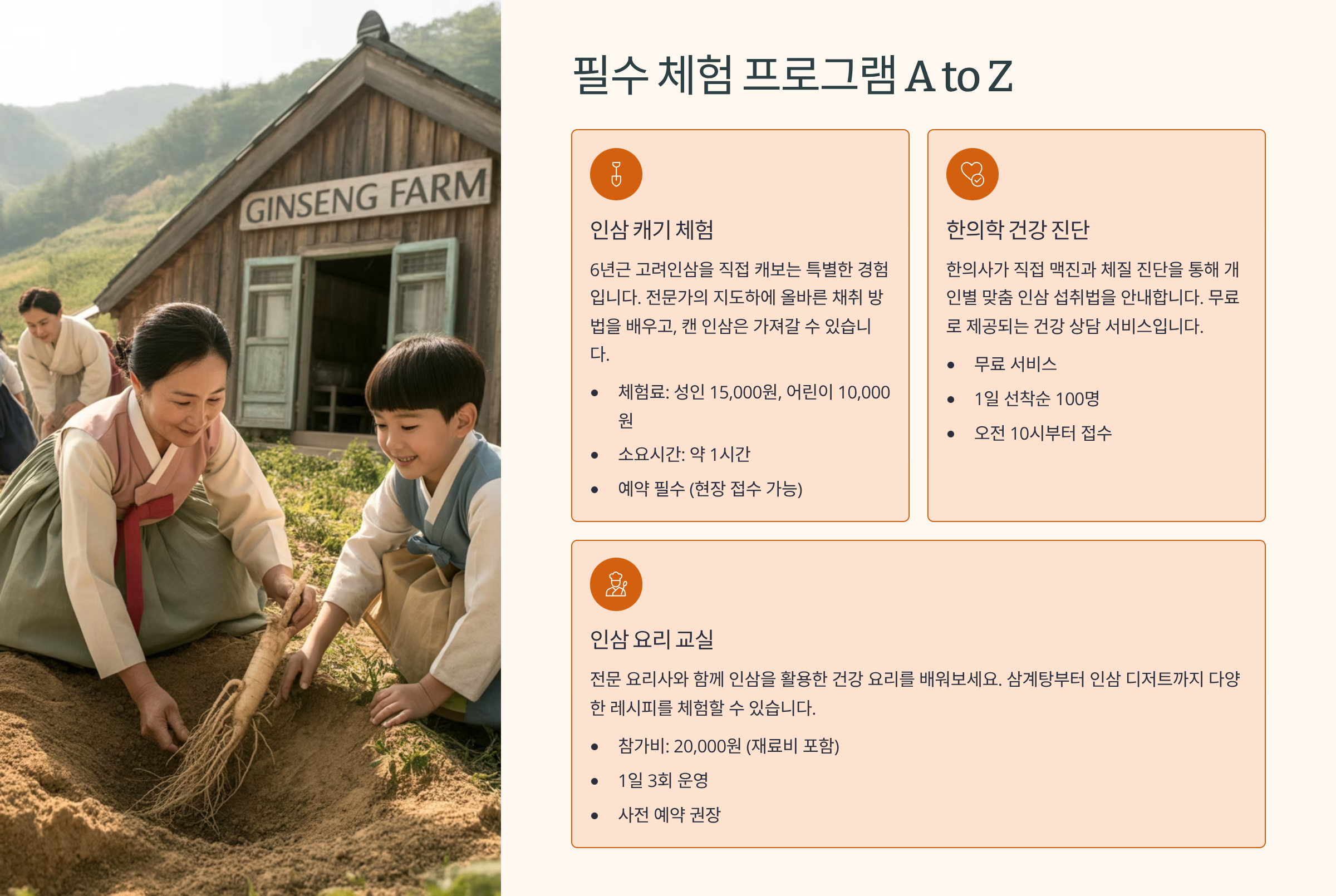 아이들을 위한 인삼아트 체험과 인삼약초요리 만들기 체험도 큰 인기를 끌 것으로 예상됩니다. 특히 올해는 어린이들이 인삼을 더욱 친숙하게 접할 수 있도록 인삼 칩, 인삼 떡꼬치 등 젊은 세대와 어린이 입맛에 맞는 간편 요리를 대거 선보일 예정입니다. 단순히 눈으로 보는 것을 넘어, 직접 손으로 만지고 맛보면서 인삼의 가치를 온몸으로 느낄 수 있는 프로그램들로 구성되어 있어 방문객들의 만족도가 높을 것으로 기대됩니다.