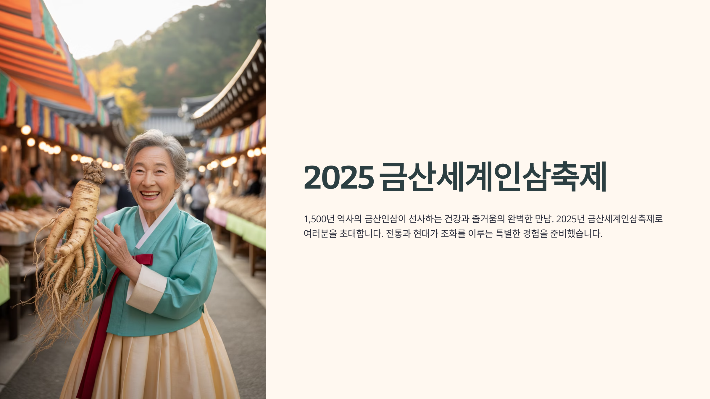 1,500년 고려인삼의 역사를 간직한 충청남도 금산에서 매년 열리는 금산세계인삼축제는 단순한 지역 축제를 넘어 대한민국을 대표하는 산업형 축제로 자리매김했습니다. 특히 2025년 제43회 축제는 인삼의 전통적인 가치에 더해, AI, 로봇, K-팝 등 첨단 기술과 현대 문화를 결합하여 더욱 풍성하고 역동적인 경험을 선사할 예정입니다. 지난해 115만 명이 방문해 1,366억 원의 경제 효과를 창출한 만큼, 올해도 많은 기대를 모으고 있습니다. 인삼의 효능을 직접 체험하고, 신선한 인삼을 저렴하게 구매하며, 다채로운 공연과 볼거리로 오감을 만족시킬 수 있는 금산세계인삼축제에 대한 모든 것을 이 글에서 상세히 안내해 드립니다.