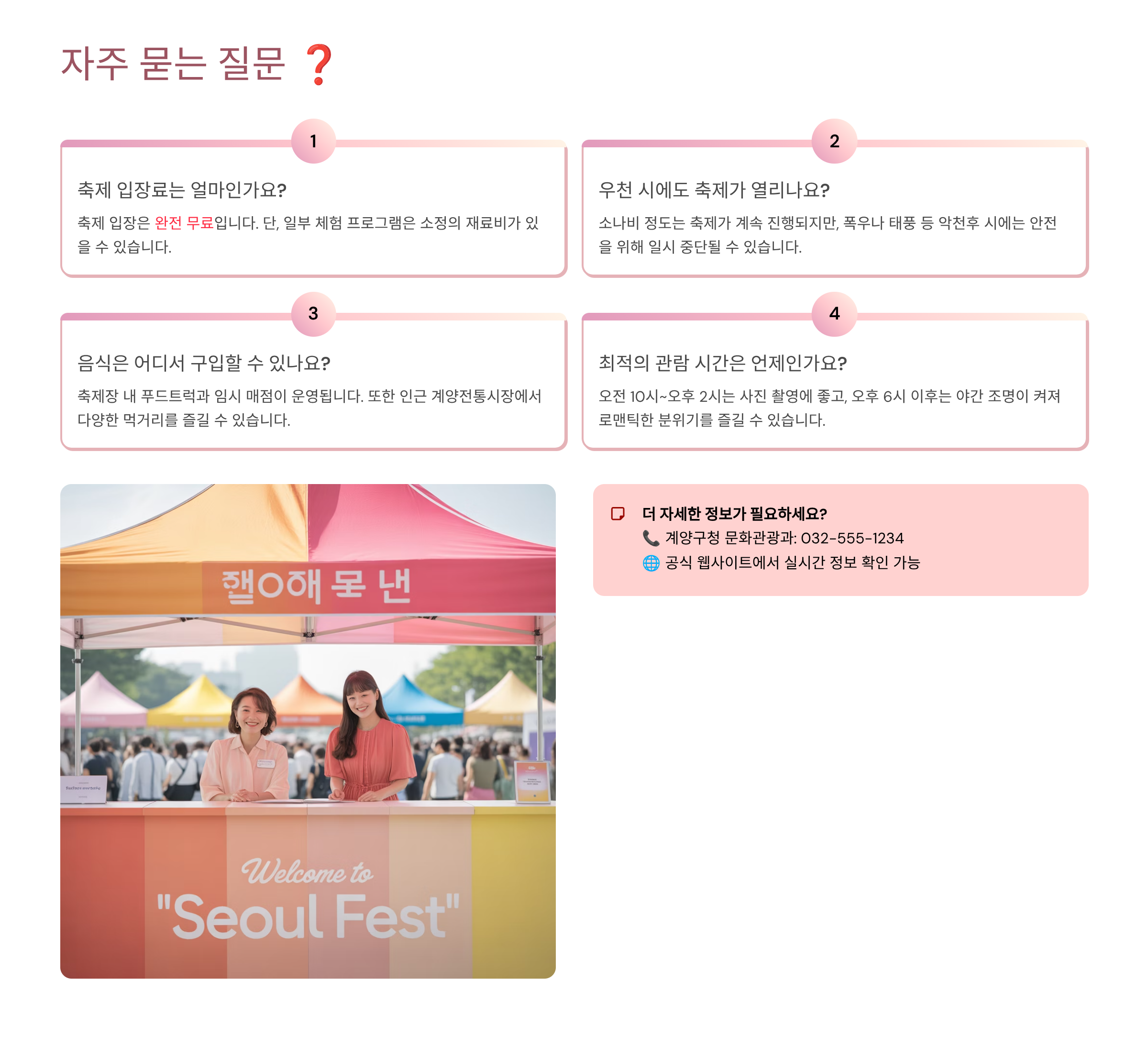 이처럼 축제와 연계된 주변 관광 명소 정보는 방문객들에게 실질적인 도움을 제공하며, '인천 계양구'라는 지역 키워드에 대한 콘텐츠 전문성을 강화하는 데 기여합니다. 특히 구글의 오토 스니펫에 노출될 수 있는 '축제와 함께 즐길 주변 명소'와 같은 주제는 검색 결과 상단에 노출될 확률을 높여줍니다. 또한, 다양한 장소에 대한 정보를 제공함으로써 방문객의 체류 시간을 늘리고, 지역 경제 활성화에도 기여할 수 있다는 점에서 매우 의미 있는 정보라 할 수 있습니다.