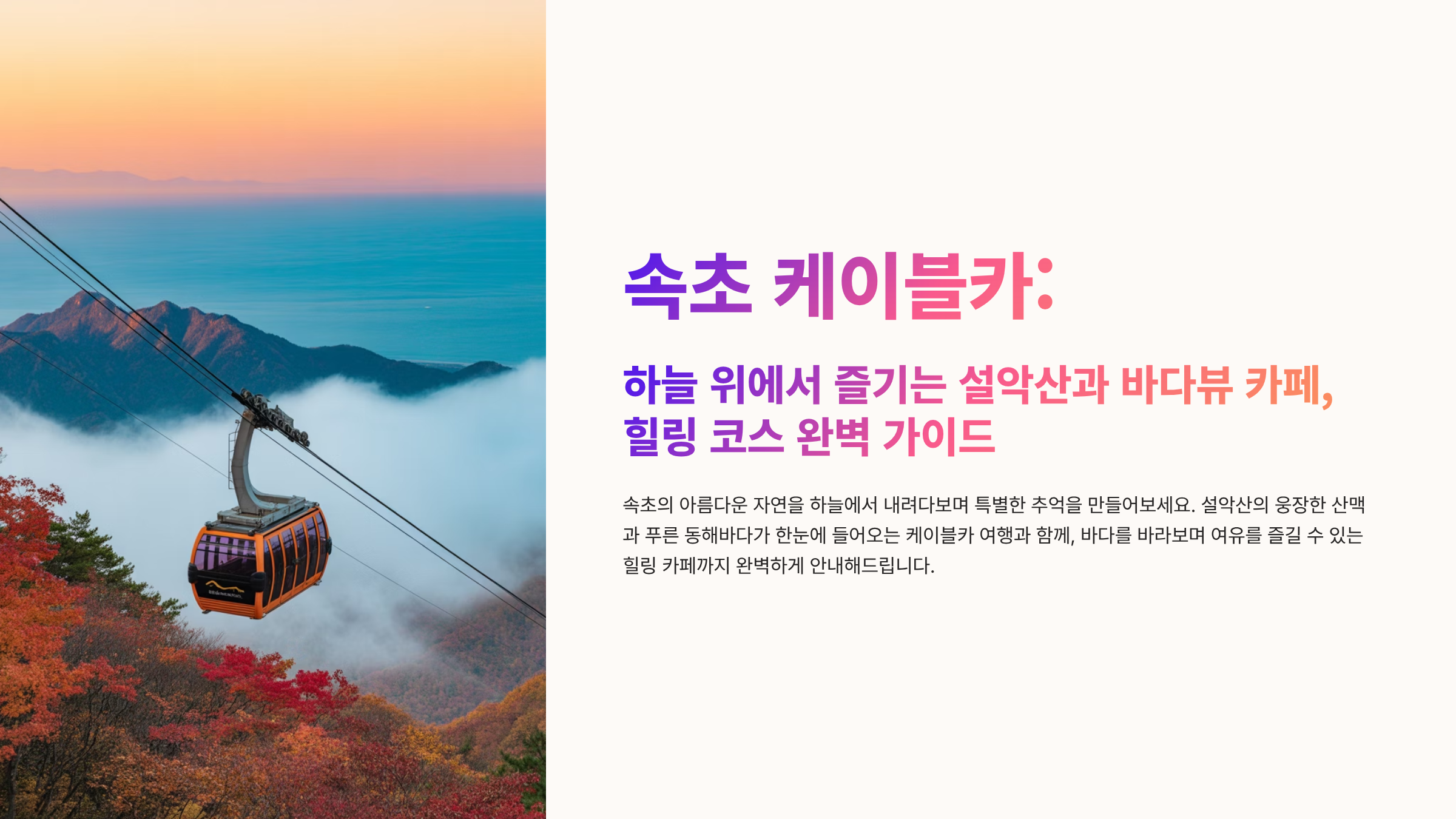 강원도 속초는 바다와 산이 공존하는 매력적인 여행지입니다. 특히, 가을의 절정에서 단풍이 붉게 물든 설악산을 한눈에 담을 수 있는 설악산 케이블카는 사계절 내내 많은 관광객들의 발길을 이끄는 필수 코스입니다. 케이블카를 타고 권금성 정상에 오르면 설악산의 웅장한 절경은 물론, 멀리 속초 시내와 동해 바다까지 한눈에 조망할 수 있어 그야말로 압도적인 경험을 선사합니다. 이와 더불어 속초는 동해 바다를 바라보며 커피 한 잔의 여유를 즐길 수 있는 감성적인 바다뷰 카페가 많기로 유명합니다. 단순한 카페를 넘어 하나의 힐링 공간으로 자리 잡은 이 곳들은 여행의 피로를 풀어주고, 아름다운 추억을 남길 수 있는 완벽한 장소입니다. 이 글에서는 2025년 최신 정보를 바탕으로 속초 케이블카의 생생한 후기와 함께, 놓치면 아쉬울 바다뷰 카페들을 엄선하여 소개해 드리겠습니다. 당신의 속초 여행을 더욱 풍성하고 특별하게 만들어 줄 알짜배기 정보들을 지금부터 함께 살펴보시죠.