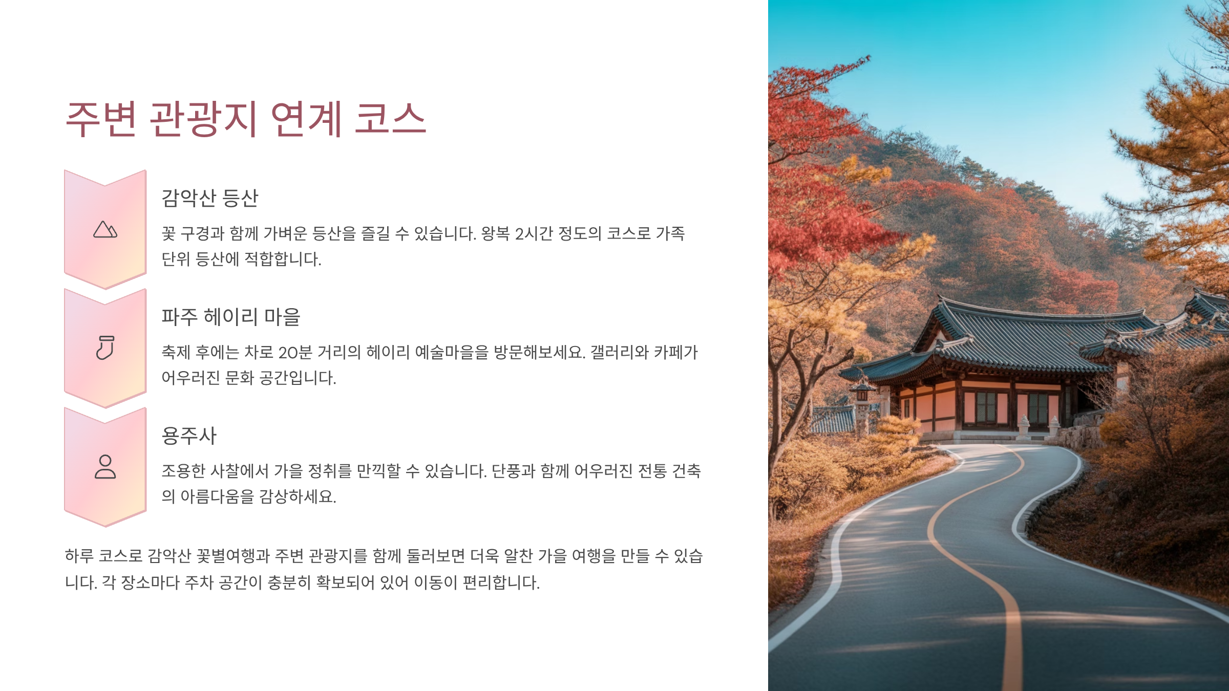 여행 동선과 취향에 맞춰 주변 관광지를 함께 계획하면 더욱 알찬 여행이 될 수 있습니다.