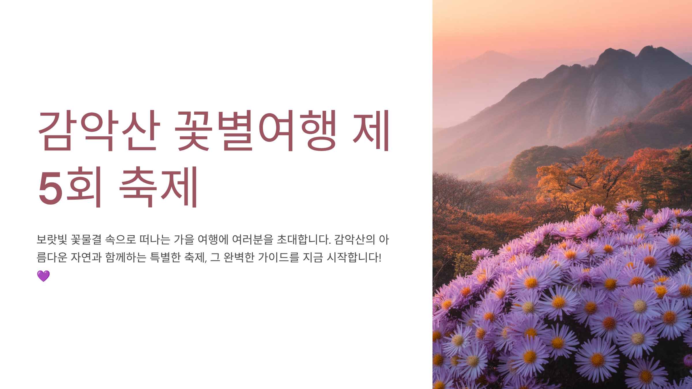 선선한 바람이 불어오는 가을, 어디론가 떠나고 싶은 마음이 드는 계절입니다. 🍂 경상남도 거창군 감악산은 해발 900m 고지에 펼쳐진 드넓은 들판에 보랏빛 아스타 국화가 만개하며 마치 동화 속 풍경 같은 아름다움을 선사합니다. 매년 가을, 수많은 방문객의 발길을 이끄는 '감악산 꽃별여행'이 올해로 제5회를 맞이하며 더욱 풍성한 프로그램으로 돌아왔는데요. '보랏빛 노을 속으로'라는 주제 아래, 감악산 별바람언덕에서 꽃과 별, 그리고 감동이 가득한 특별한 경험을 할 수 있습니다. 지금부터 제5회 감악산 꽃별여행에 대한 모든 것을 자세히 소개해 드리겠습니다.
