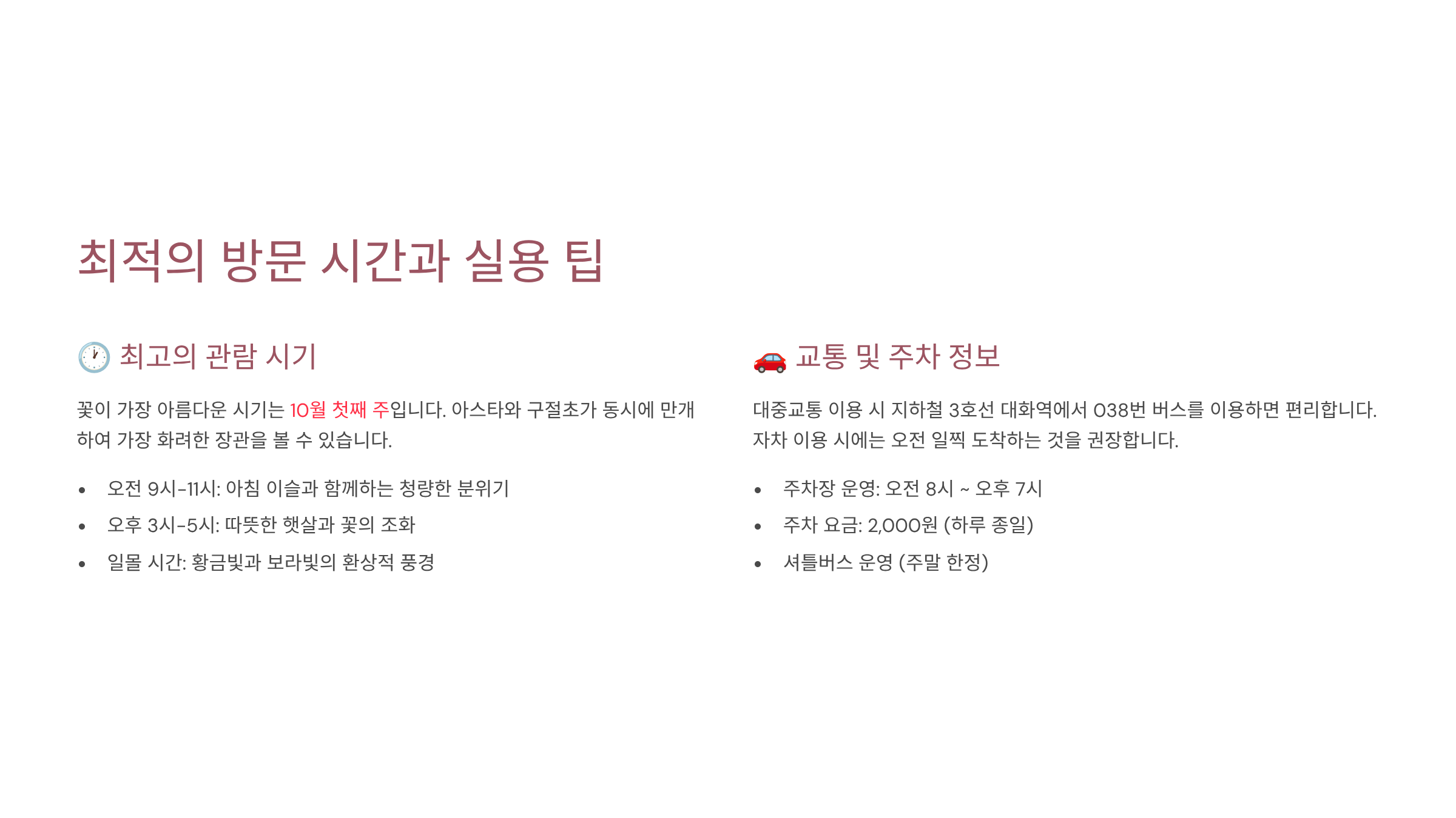 꽃의 개화 시기는 기상 상황에 따라 달라질 수 있으므로, 방문 시기를 결정할 때 참고만 하시기 바랍니다.