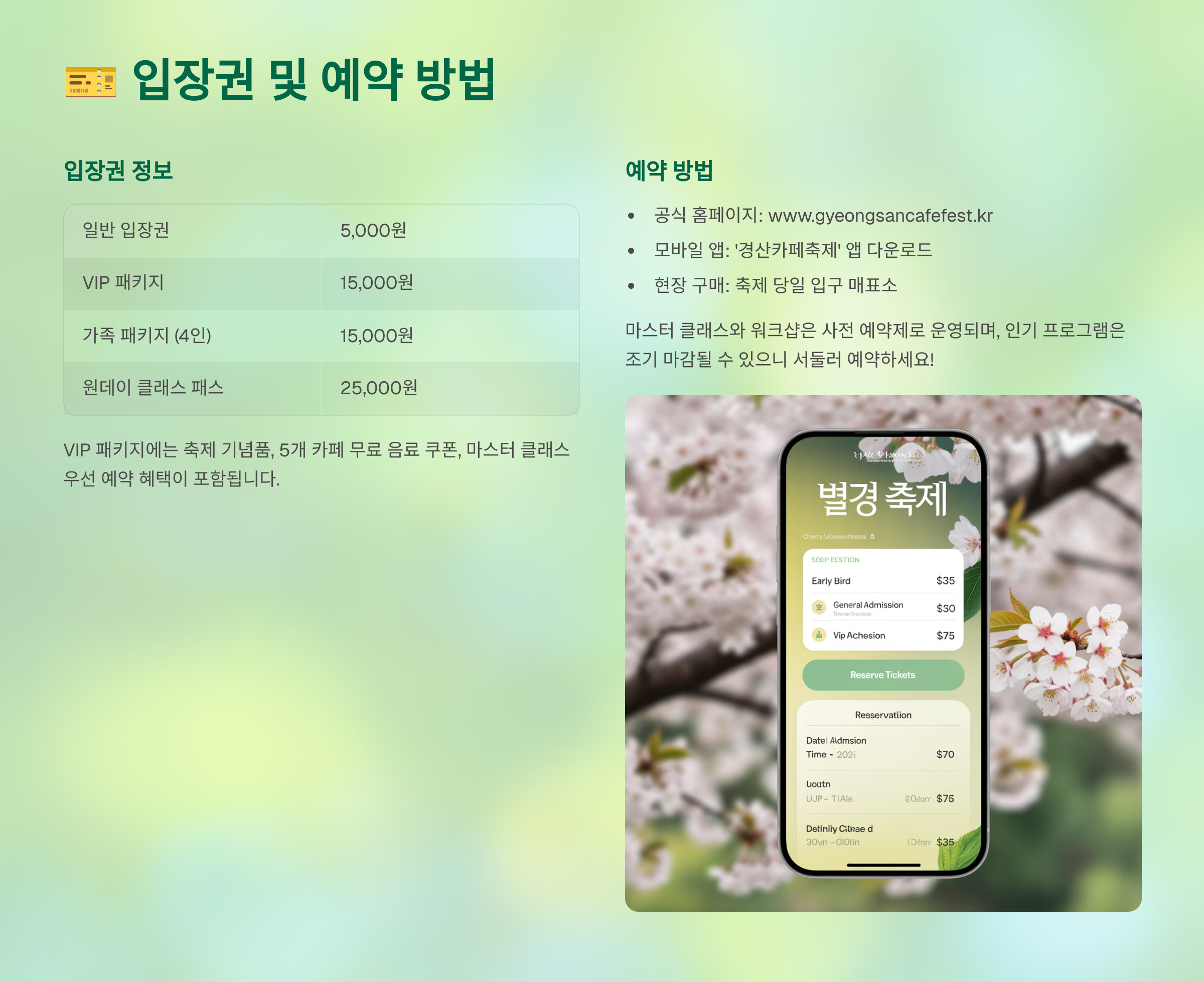 예약은 축제 공식 홈페이지와 모바일 앱에서 간편하게 할 수 있어요.