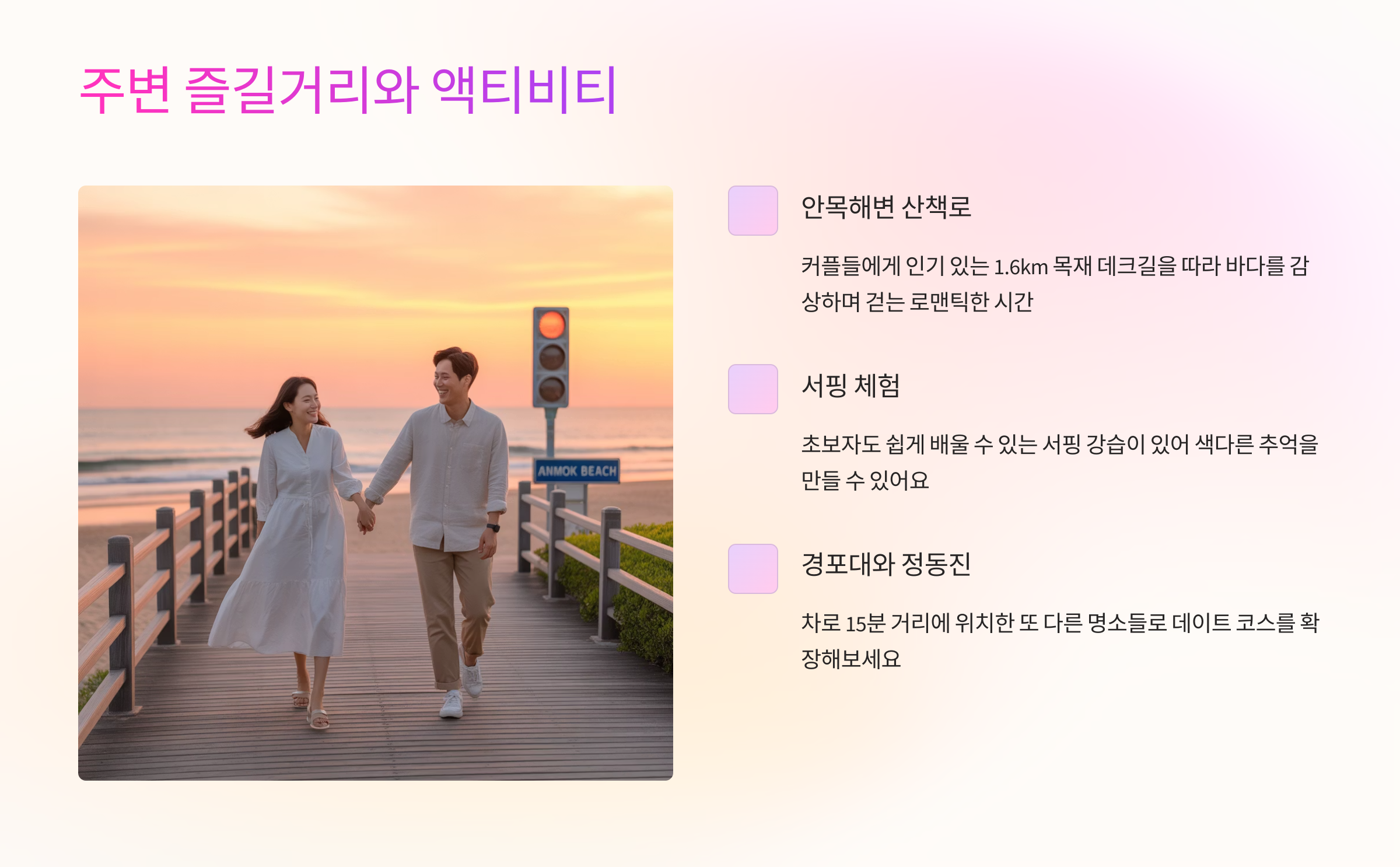 안목해변 주변에는 바다 산책, 서핑 체험, 전통시장 방문 등 다양한 즐길거리가 많아요. 카페 거리 방문 후 액티비티로 하루를 알차게 보내기 좋답니다.