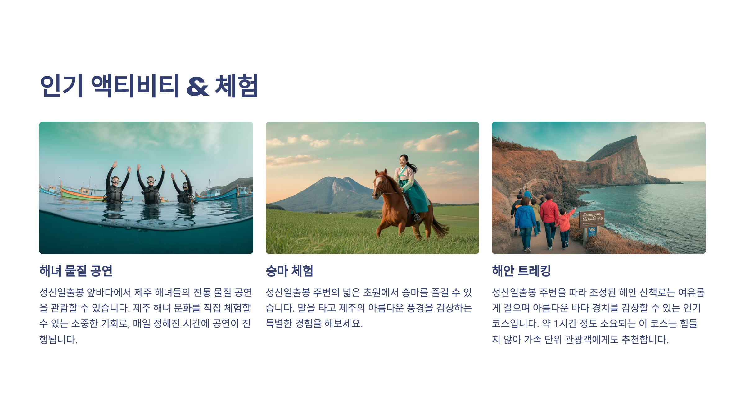 성산일출봉 주변에서는 다양한 액티비티를 즐길 수 있어요. 해안가에서 즐기는 해양 스포츠부터 승마 체험, 자전거 대여까지 선택지가 많답니다. 날씨 좋은 날엔 특히 야외 활동하기 딱 좋아서 가족, 친구, 연인 모두에게 인기가 많아요.