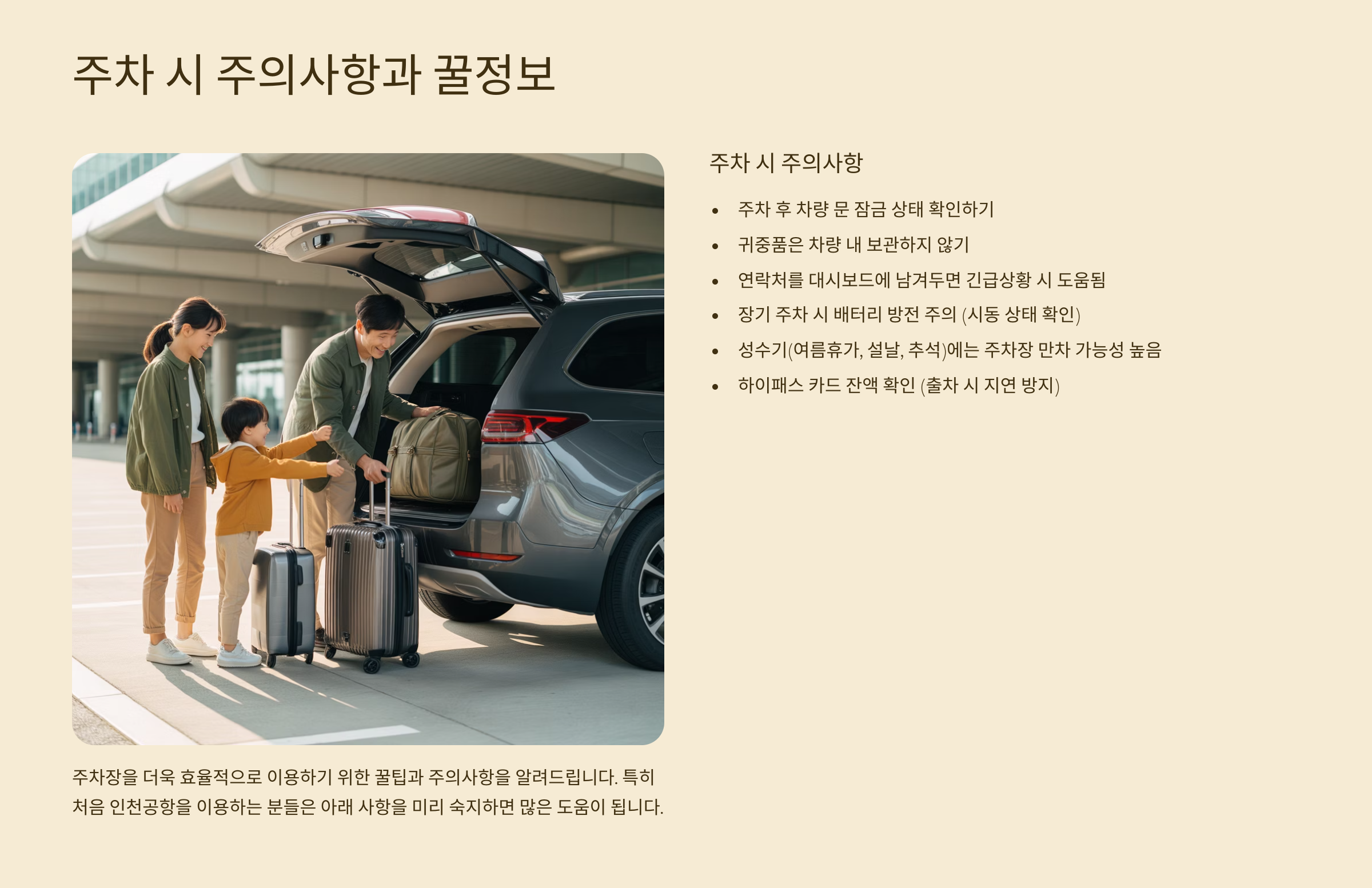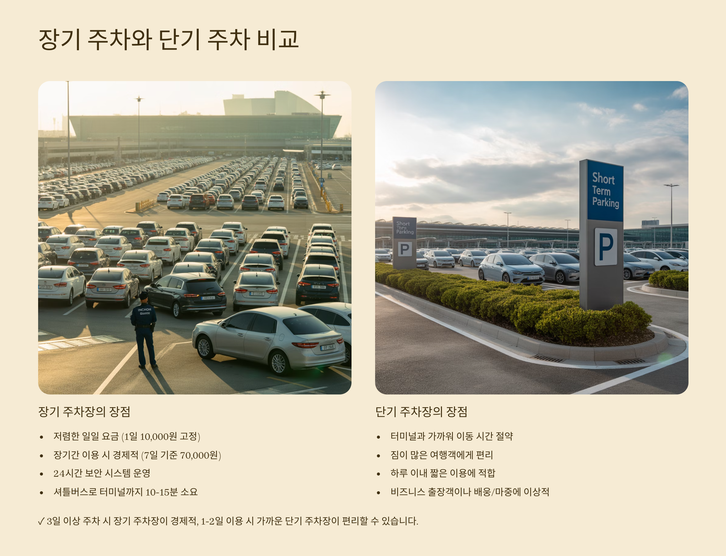 | 단기 주차 | 터미널 가까움, 빠른 출입 | 요금 비쌈, 장시간 부담 | 단기간 방문객 |