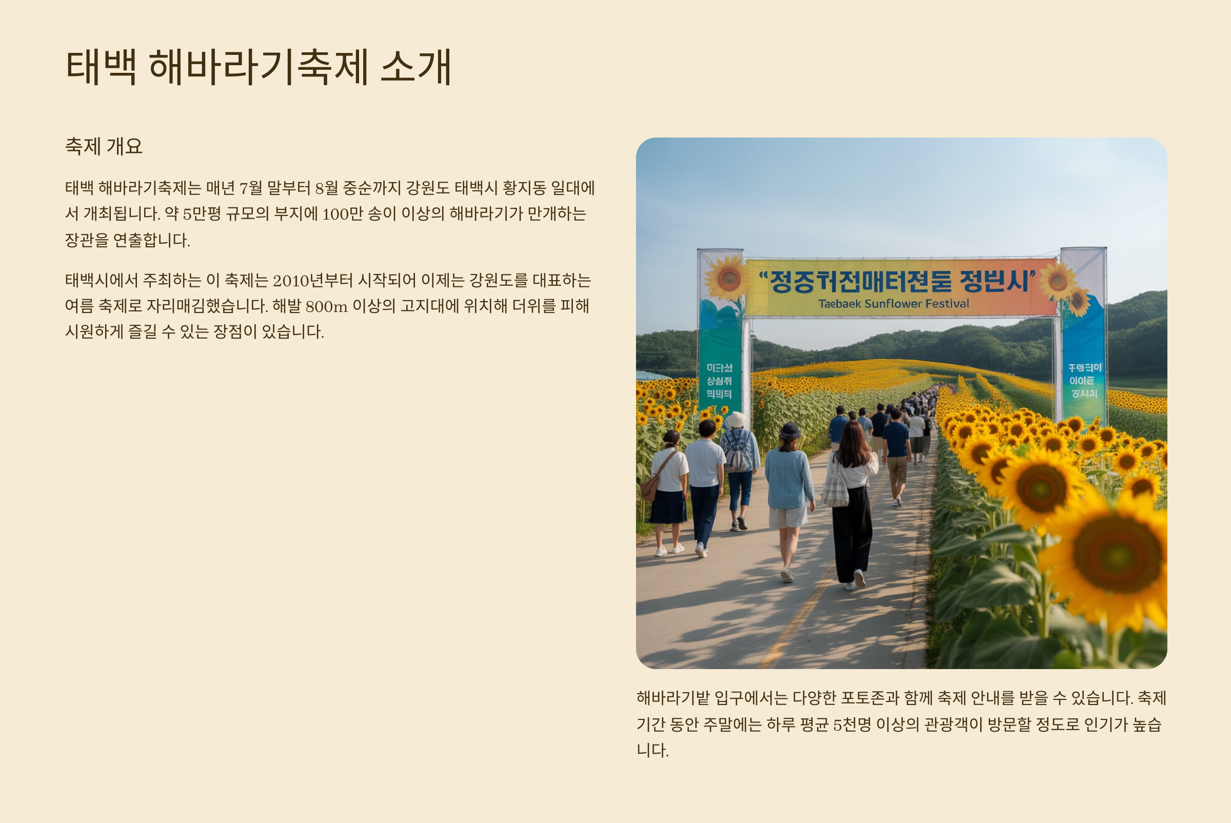 * 이 정보는 2024년 태백 해바라기축제 기준이며, 변동 가능성이 있으니 방문 전 꼭 최신 정보를 확인하세요.