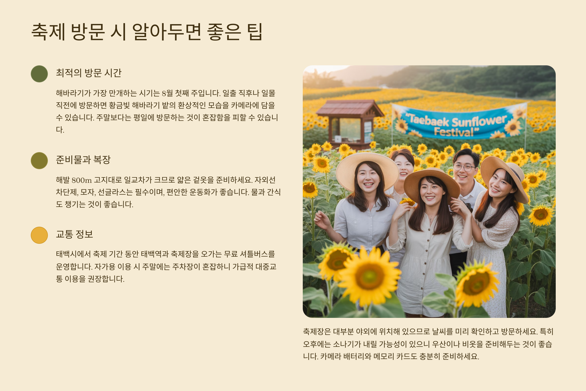 태백 해바라기축제를 즐기려면 몇 가지 알아두면 좋은 팁이 있어요. 축제 기간은 여름철이기 때문에 낮에는 더울 수 있으니 충분한 물과 모자를 준비하는 게 좋아요.