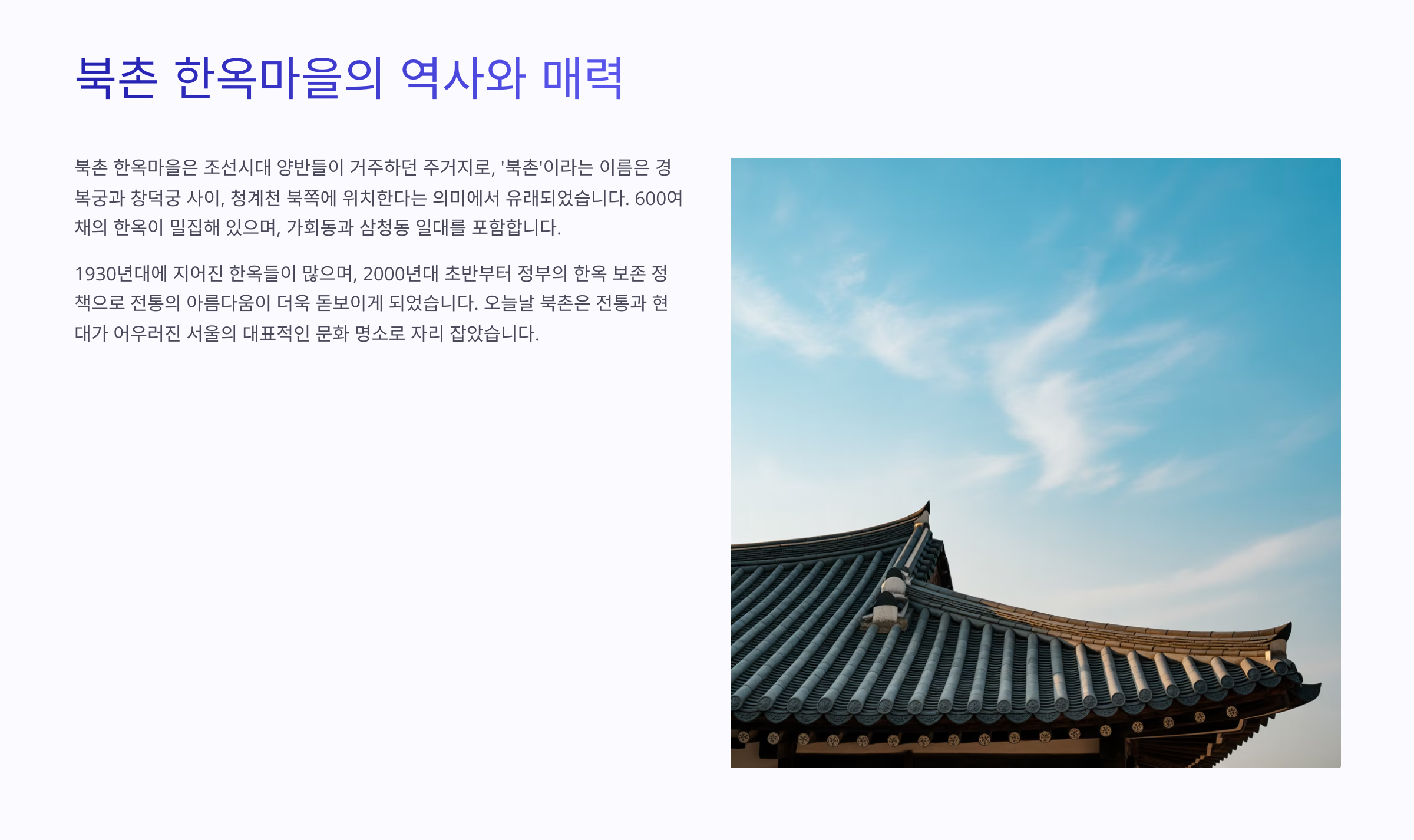 서울의 심장, 북촌의 숨겨진 매력을 테마별로 탐험해 보세요.