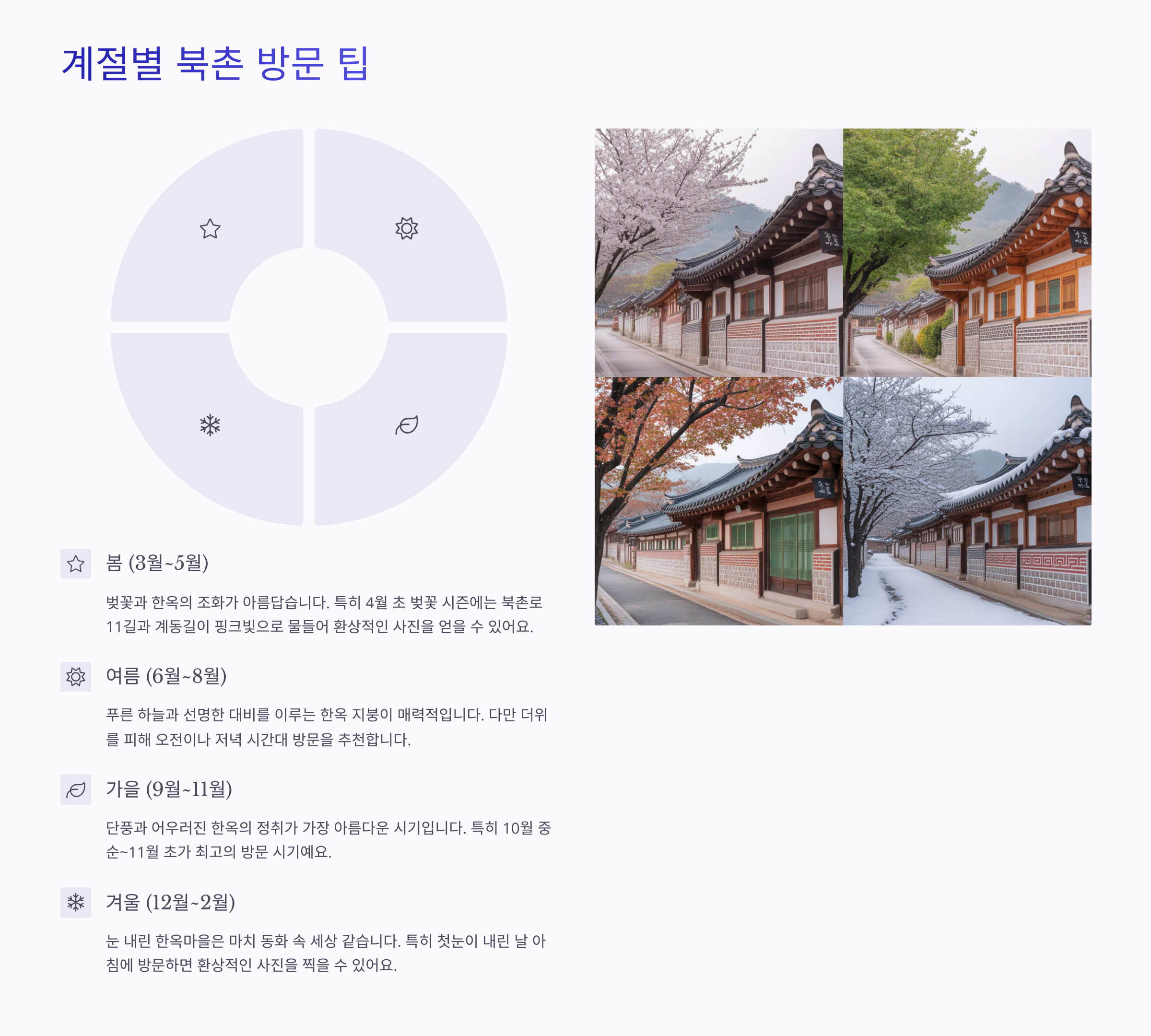 계속해서 계절별 북촌 방문 팁과 함께 여행 계획 세우기 좋은 정보도 알려줄게요. 날씨와 시간대별로 준비하면 더욱 완벽한 여행이 될 거예요.