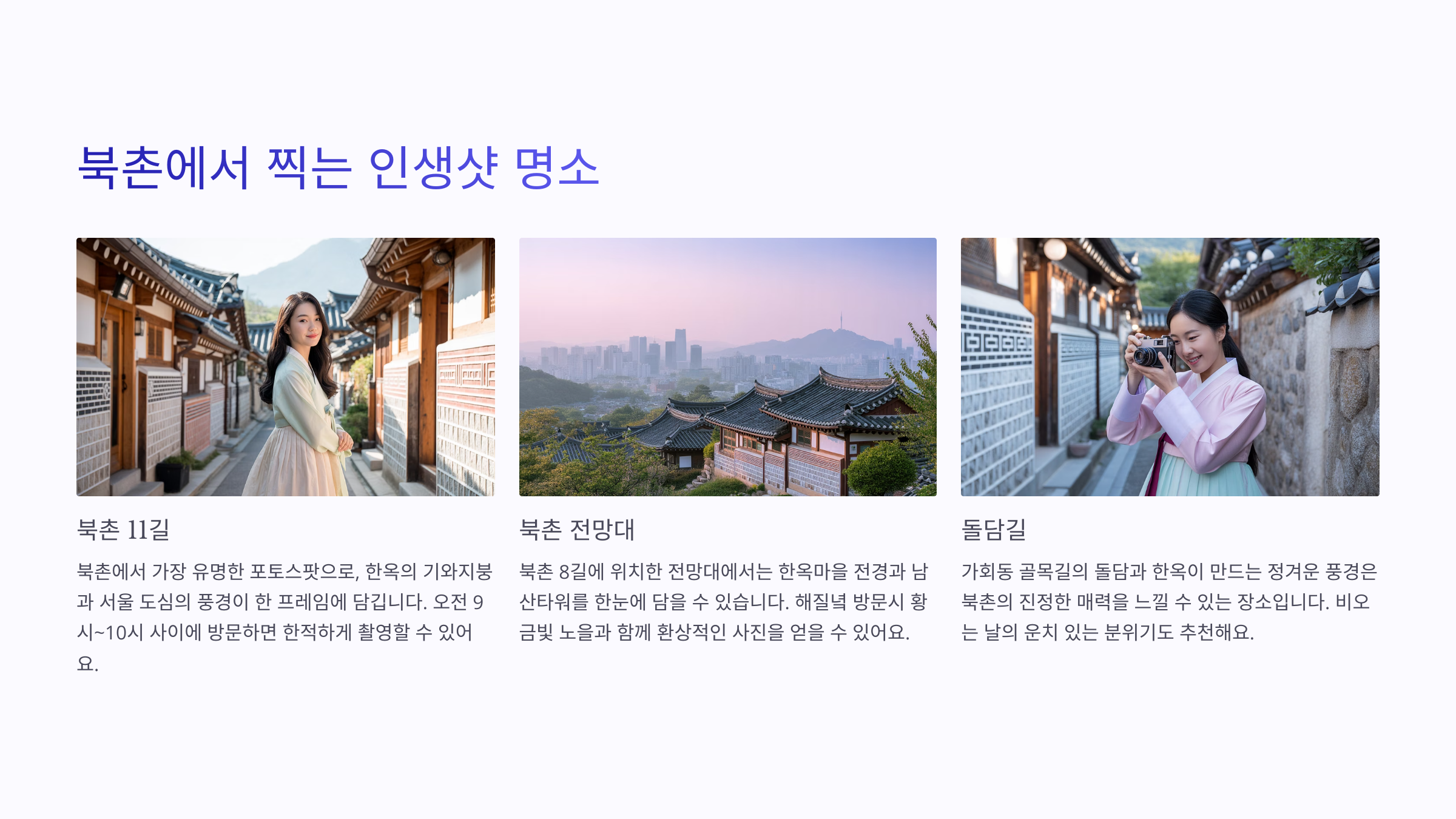 이어서 북촌에서 꼭 가봐야 할 인생샷 명소를 소개할게요. 사진 찍기에 최적화된 핫플레이스를 놓치지 말아요!
