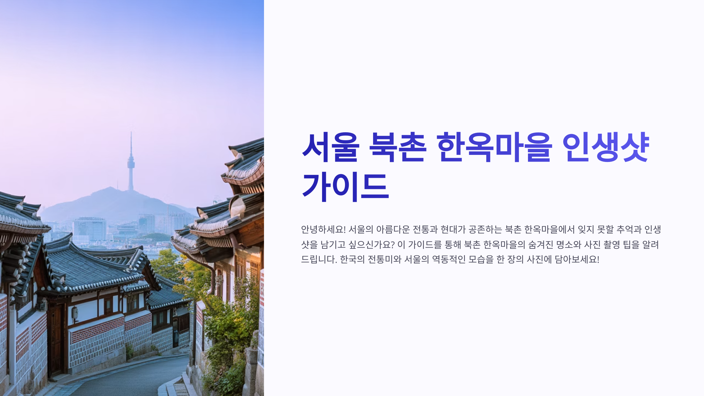 서울 북촌 한옥마을은 서울 도심 속 전통과 현대가 조화를 이루는 특별한 공간이에요. 옛 한옥의 멋을 간직하면서도 사진 찍기 좋은 장소가 많아서 인생샷을 남기기에 딱 좋답니다.