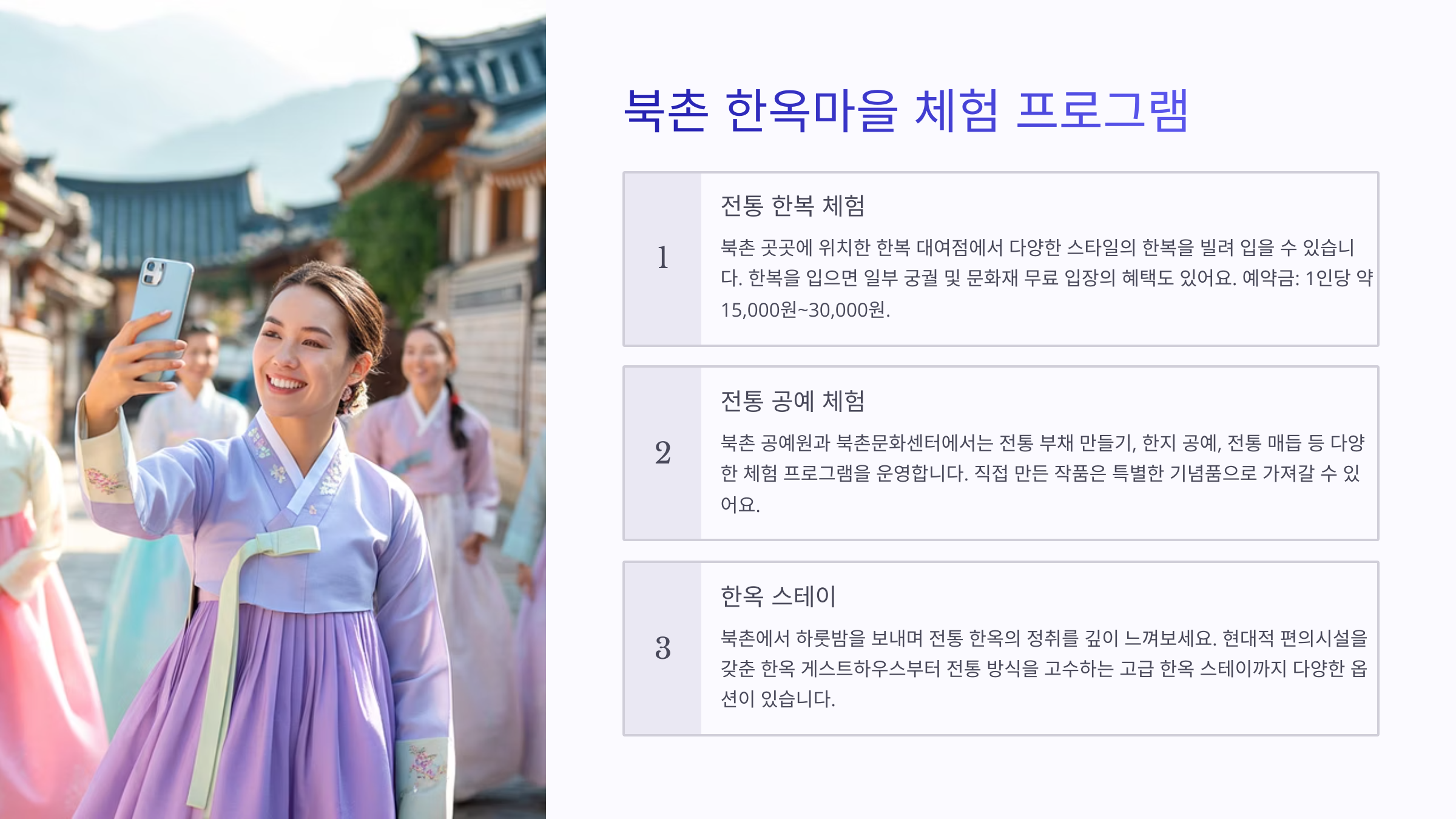 계절마다 북촌은 완전히 다른 매력을 보여줘서 언제 방문해도 좋지만, 나만의 여행 스타일에 맞게 방문 시기를 골라보는 것도 여행의 재미 중 하나예요. 다음은 북촌에서 할 수 있는 다양한 체험 프로그램을 소개할게요.
