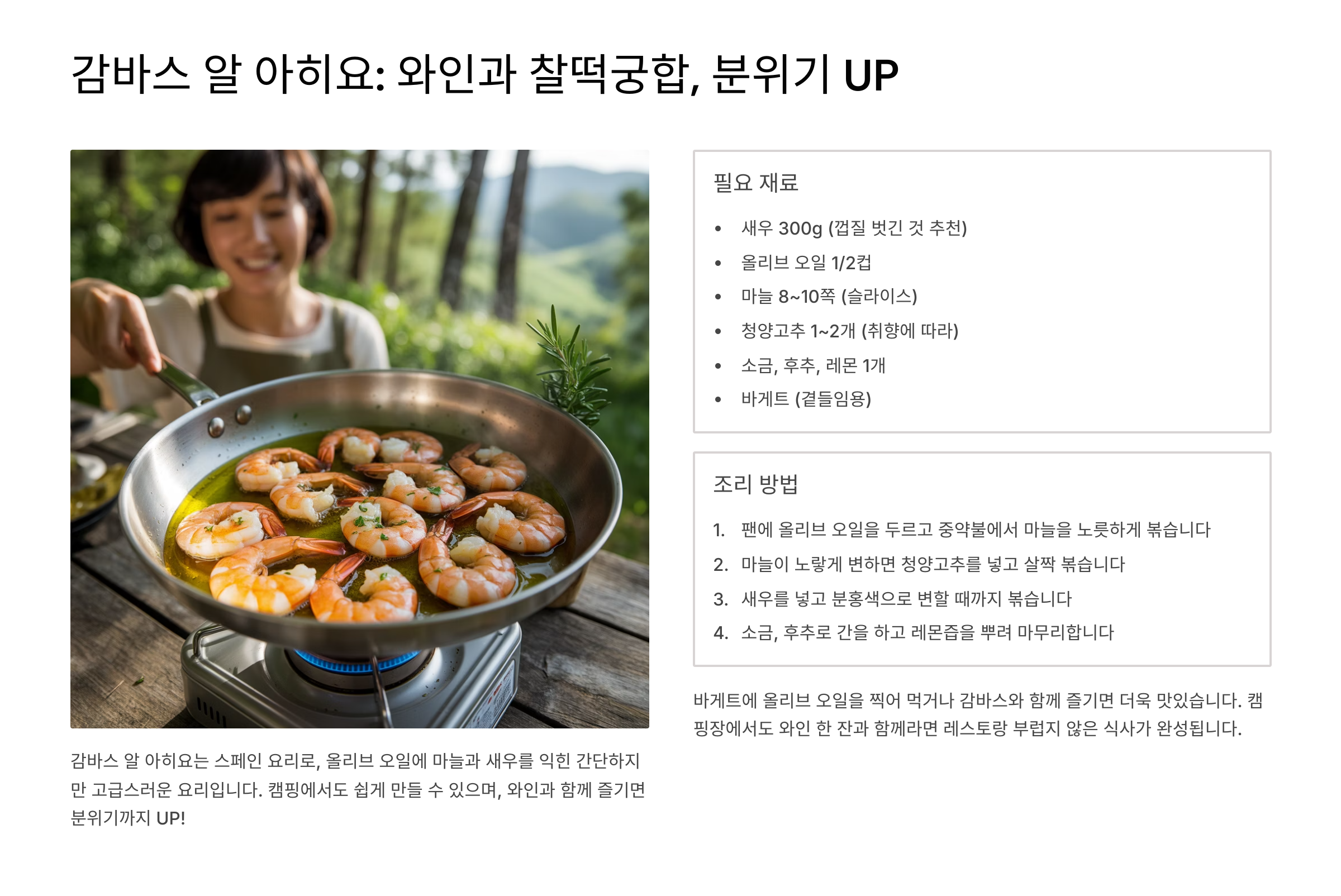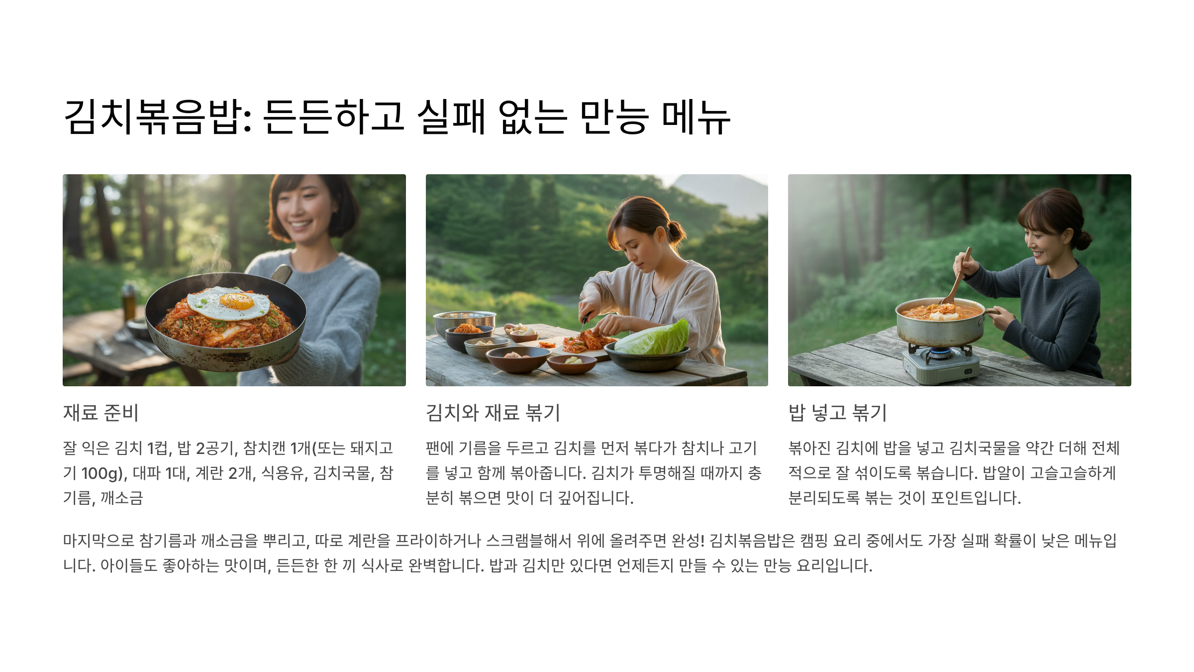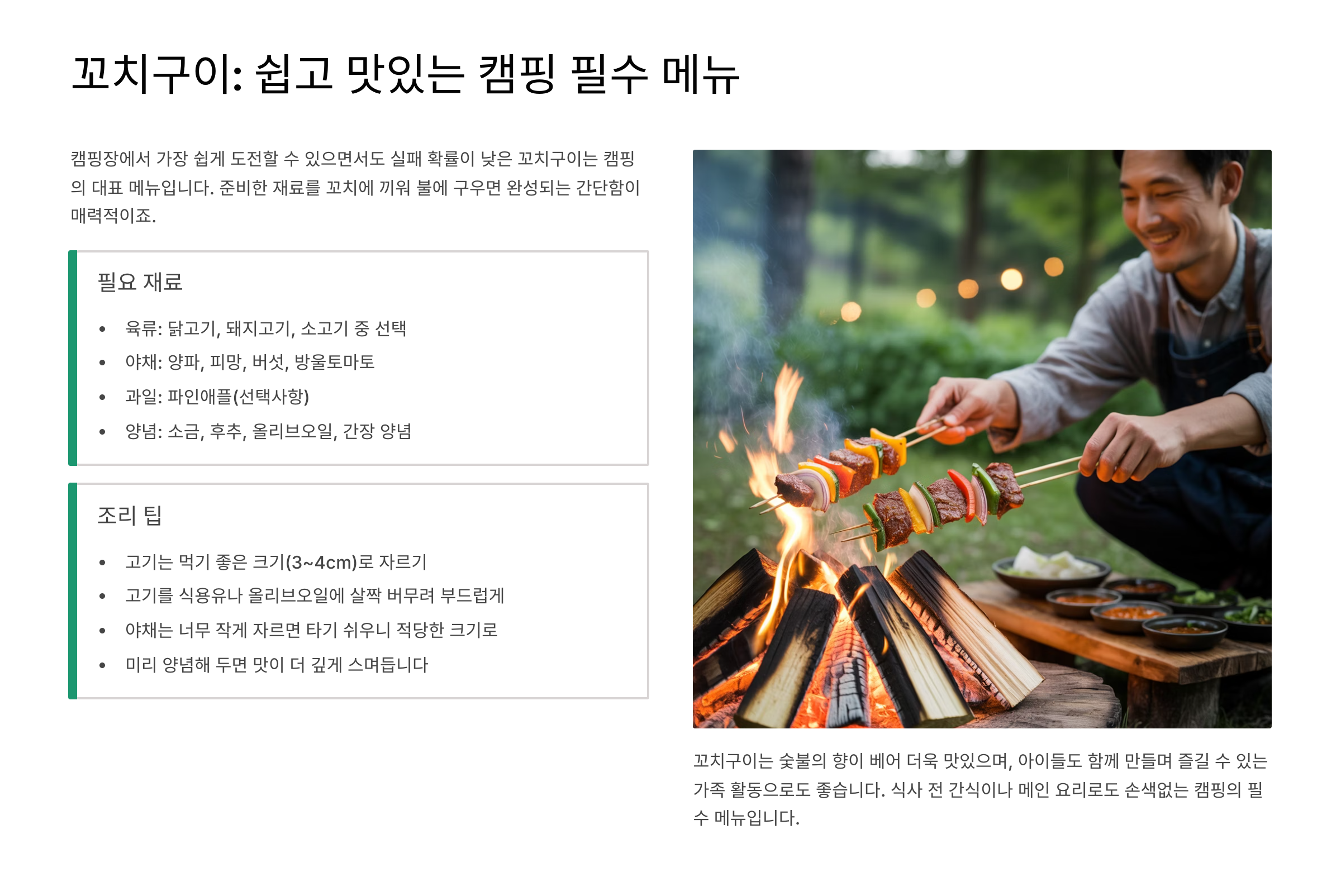 면책 조항: 본 블로그 글은 일반적인 캠핑 음식 준비 및 조리법에 대한 정보를 제공합니다. 개인의 건강 상태, 알레르기, 특정 식단 요구사항에 따라 레시피나 재료를 조절해야 할 수 있습니다. 모든 캠핑 요리 시에는 위생과 안전 수칙을 철저히 준수해야 하며, 화기 사용에 각별히 주의하시기 바랍니다. 제공된 정보로 인해 발생할 수 있는 직간접적인 손해에 대해 작성자는 책임을 지지 않습니다. 항상 안전하고 즐거운 캠핑을 위해 스스로 충분한 사전 준비와 주의를 기울이시길 바랍니다.