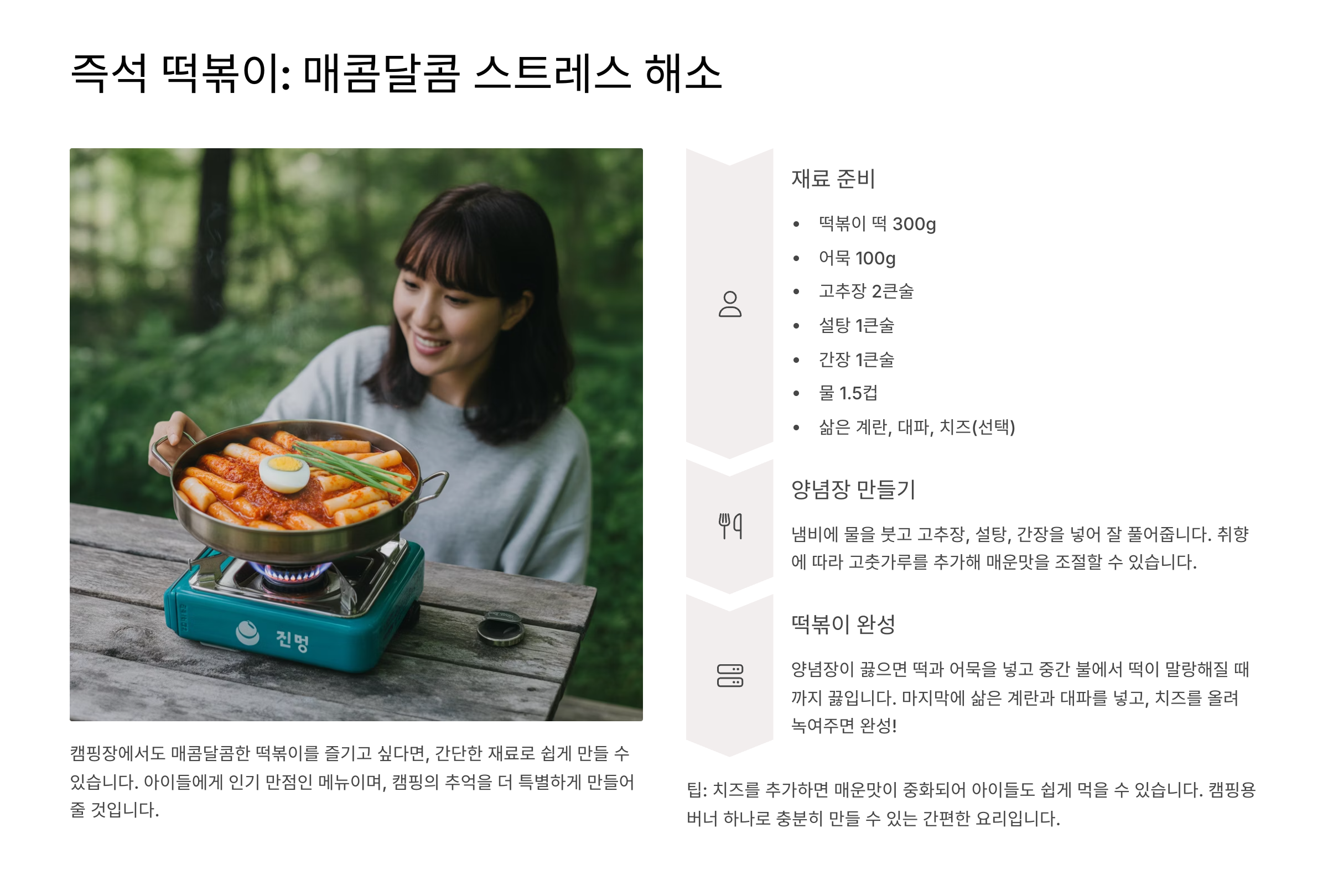 캠핑 중 갑자기 매콤한 음식이 당길 때, 즉석 떡볶이 키트만 있다면 걱정 없습니다. 시판되는 즉석 떡볶이 키트 중에는 야채까지 손질되어 있는 제품이 많아, 물만 붓고 끓이면 바로 맛있는 떡볶이를 즐길 수 있습니다. 어묵, 라면 사리 등을 추가하면 더욱 푸짐하게 즐길 수 있습니다.