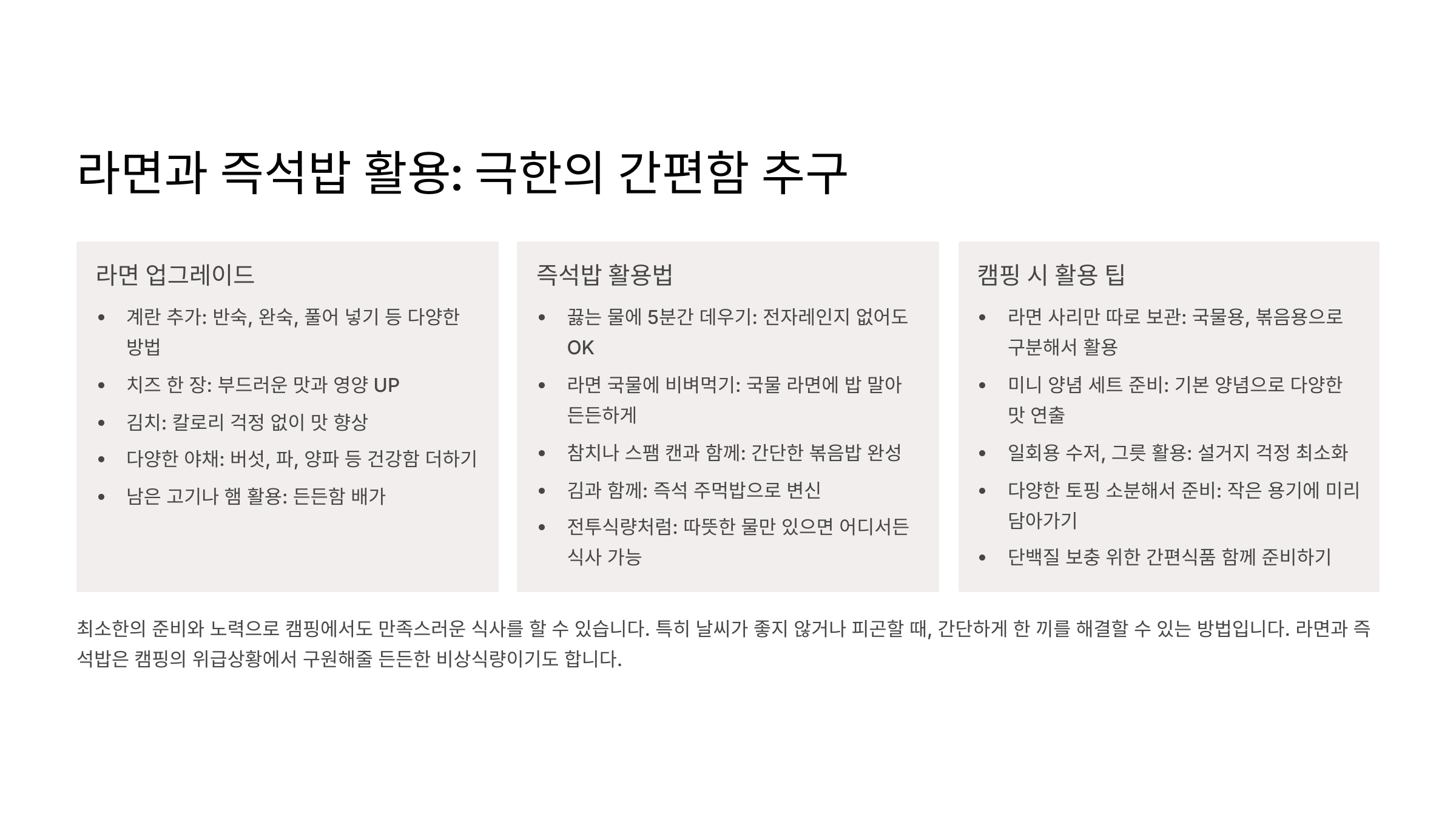 정말 아무것도 하기 싫을 때는 **라면과 즉석밥** 조합이 최고입니다. 다양한 종류의 라면과 즉석밥을 준비해가면, 뜨거운 물만으로도 든든한 한 끼 식사를 해결할 수 있습니다. 끓여 먹는 라면은 물론, 컵라면도 훌륭한 선택입니다. 햇반은 데워서 김치나 간단한 반찬과 함께 먹으면 됩니다.