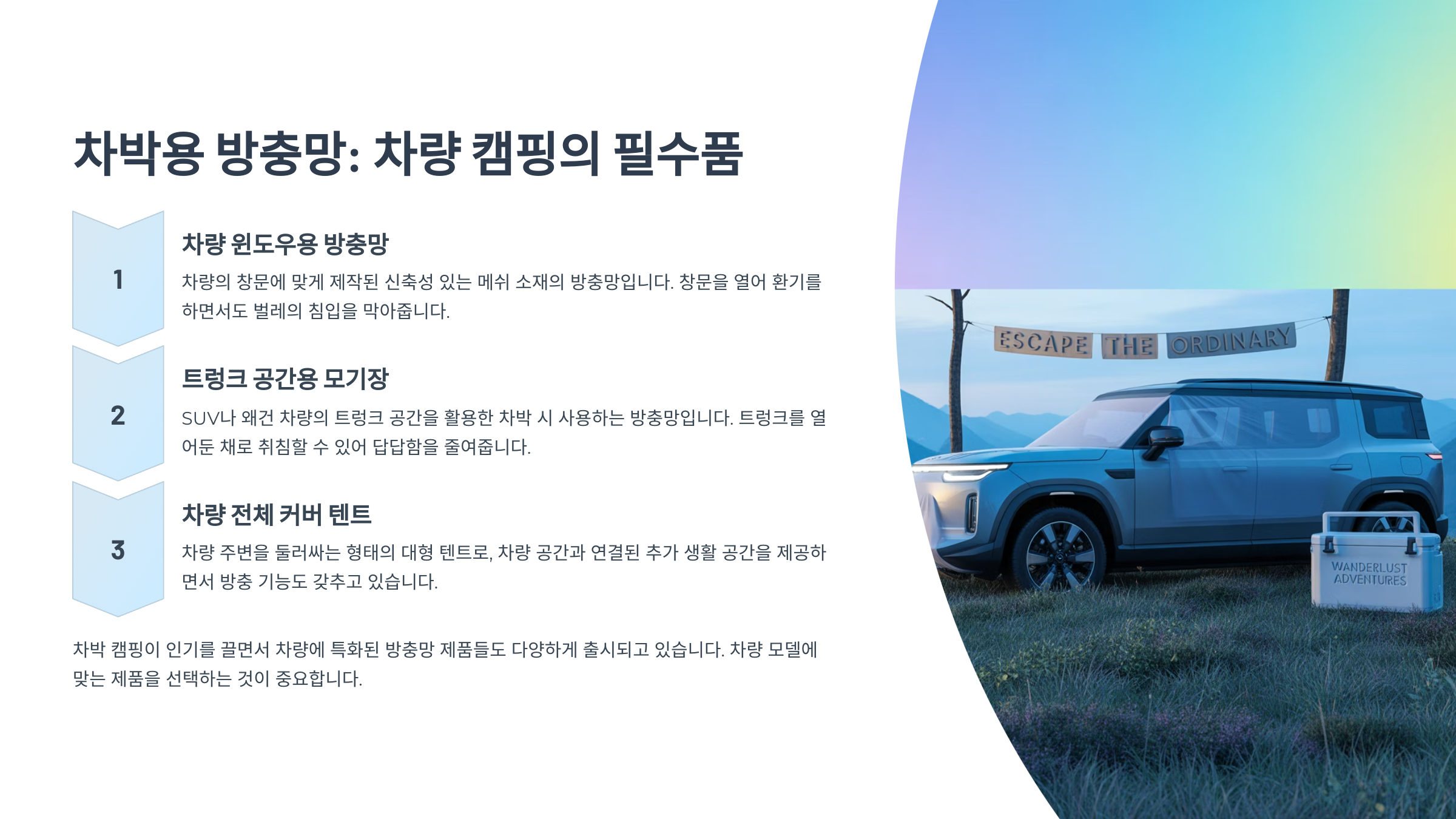 차박(차+숙박) 캠핑을 즐기는 분들에게는 차량용 방충망이 필수적입니다. 차량 문이나 트렁크 문에 설치하여 모기나 벌레의 침입 없이 시원한 바람을 맞으며 잠들 수 있도록 해줍니다. 주로 자석이나 고무 밴드 형태로 차량에 쉽게 부착할 수 있으며, 차량 모델에 맞는 맞춤형 제품도 있습니다. 통풍과 모기 차단 효과를 동시에 얻을 수 있어 차박의 쾌적함을 한층 높여줍니다. 설치 및 해체가 간편하고 수납 공간을 적게 차지하는 제품을 선택하는 것이 중요합니다.