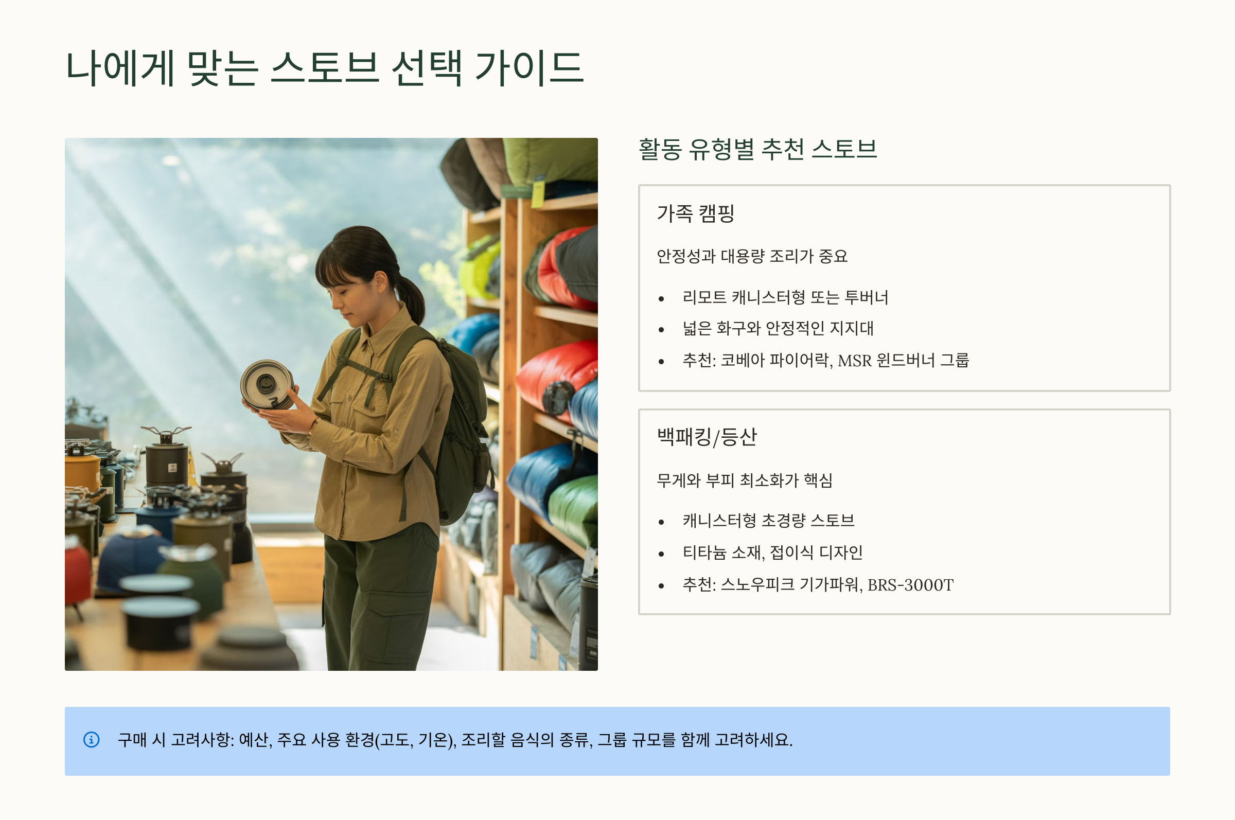 | 사용 목적 | 백패킹, 등산, 오토캠핑, 솔로/단체 | 무게, 부피, 안정성, 조리 용이성 |