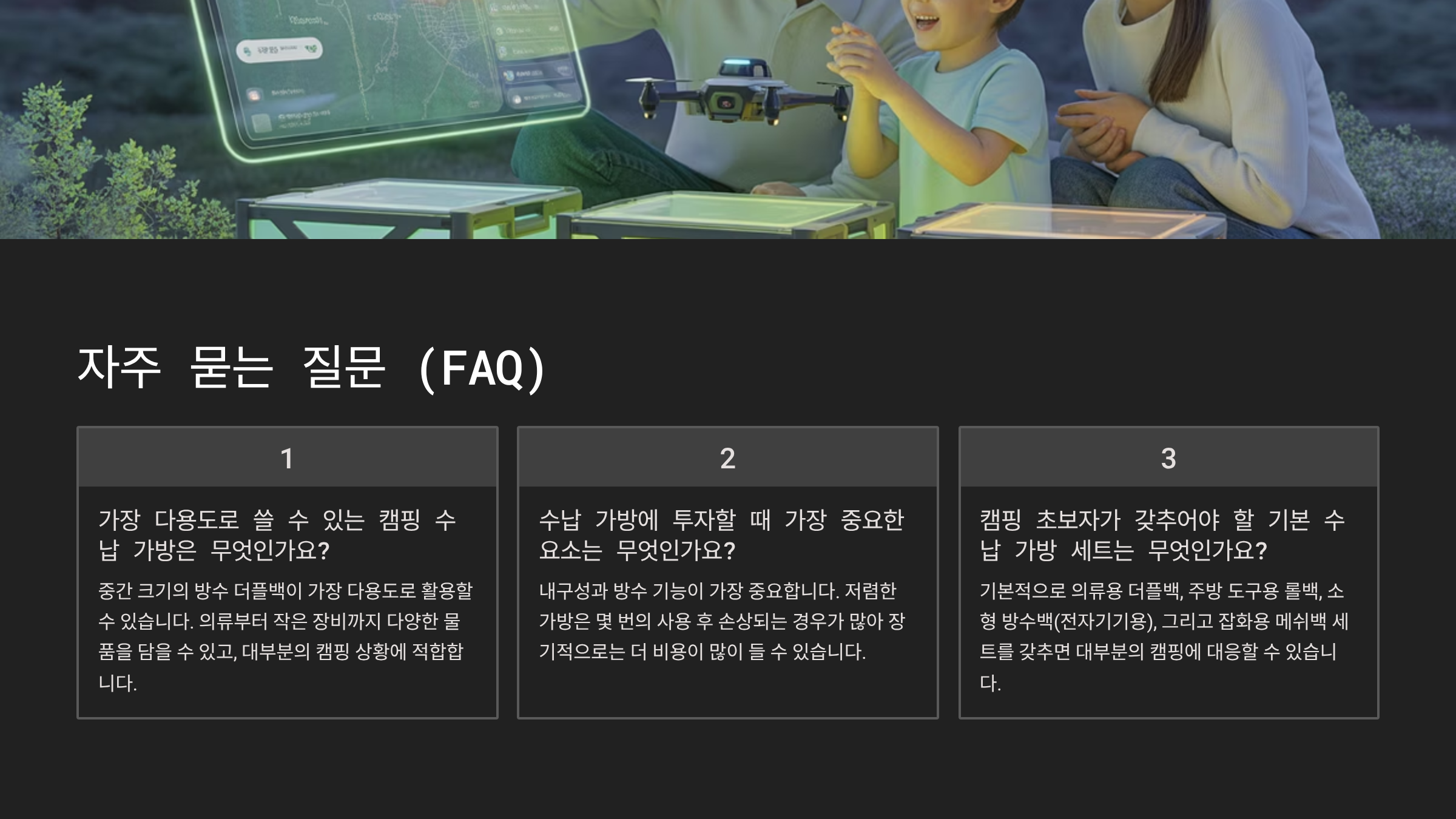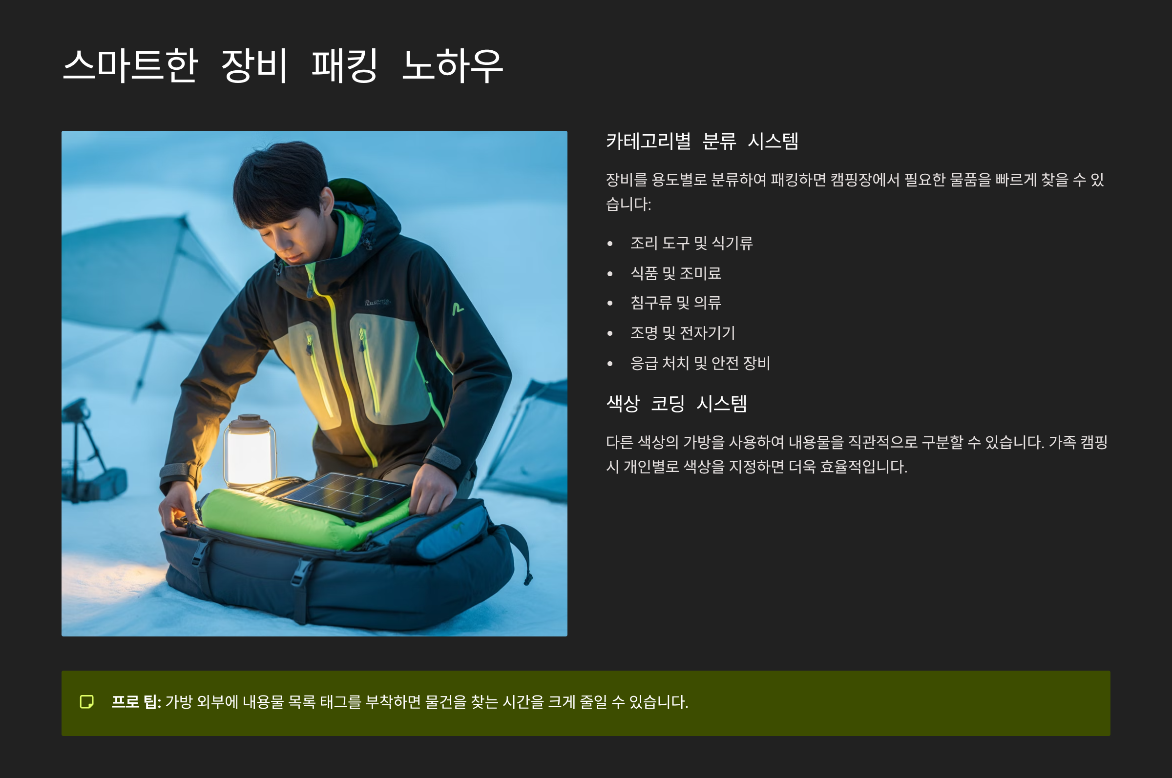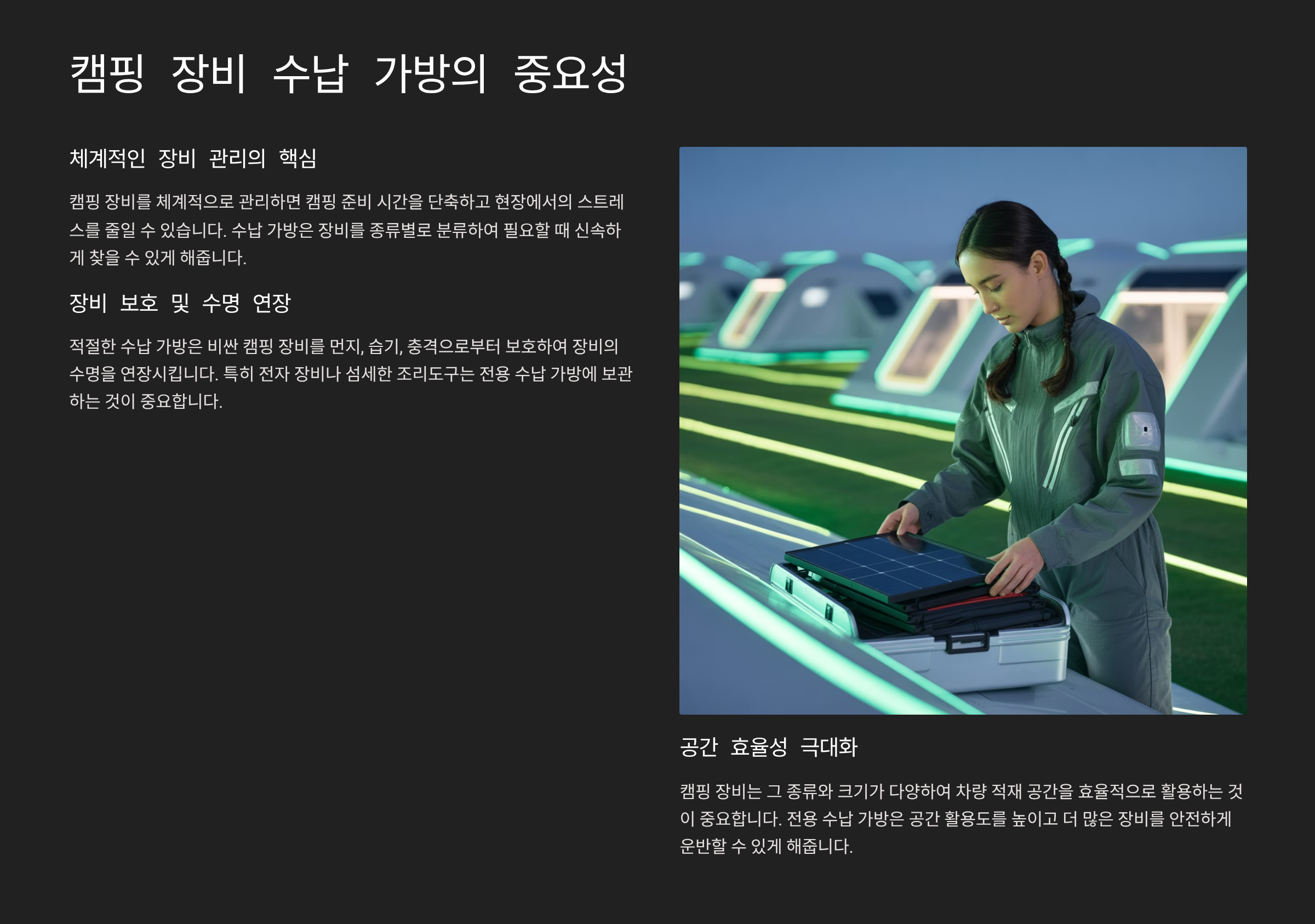 | 캠핑 환경 조성 | 깔끔한 장비 정리로 시각적 만족감 증대 | 쾌적하고 정돈된 캠핑 분위기 연출 |